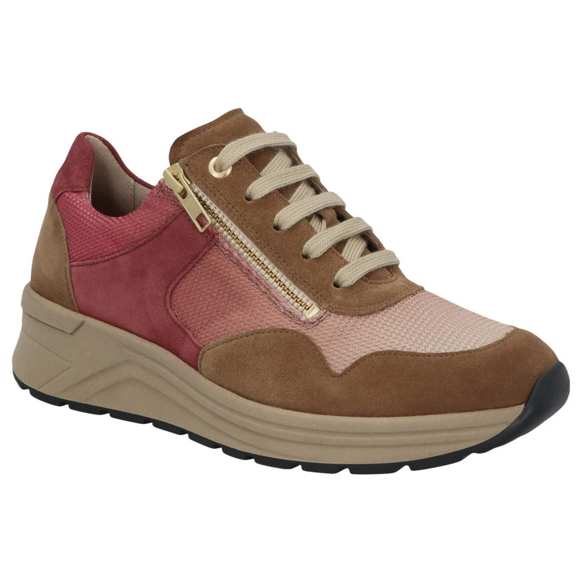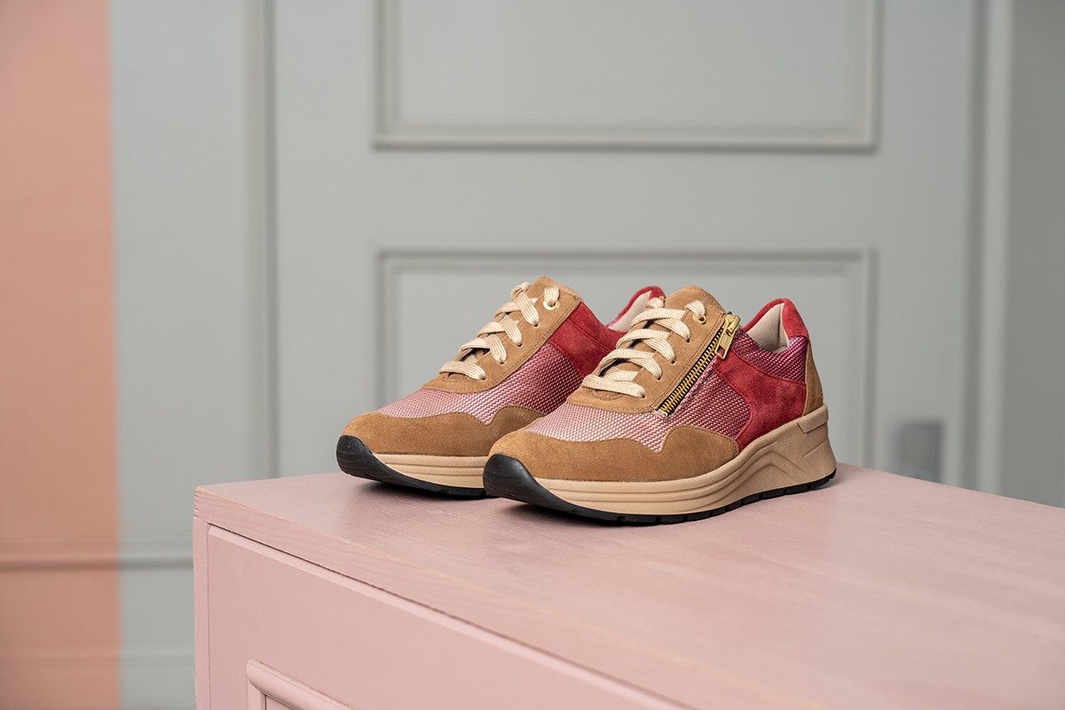 Комбинированные кроссовки с цветным градиентом на высокой подошве выполнены из мягкой замши со вставками из стрейч-текстиля (снимает давление с деформированных участков стопы). Красивый красный градиент придает модели модный спортивный вид.