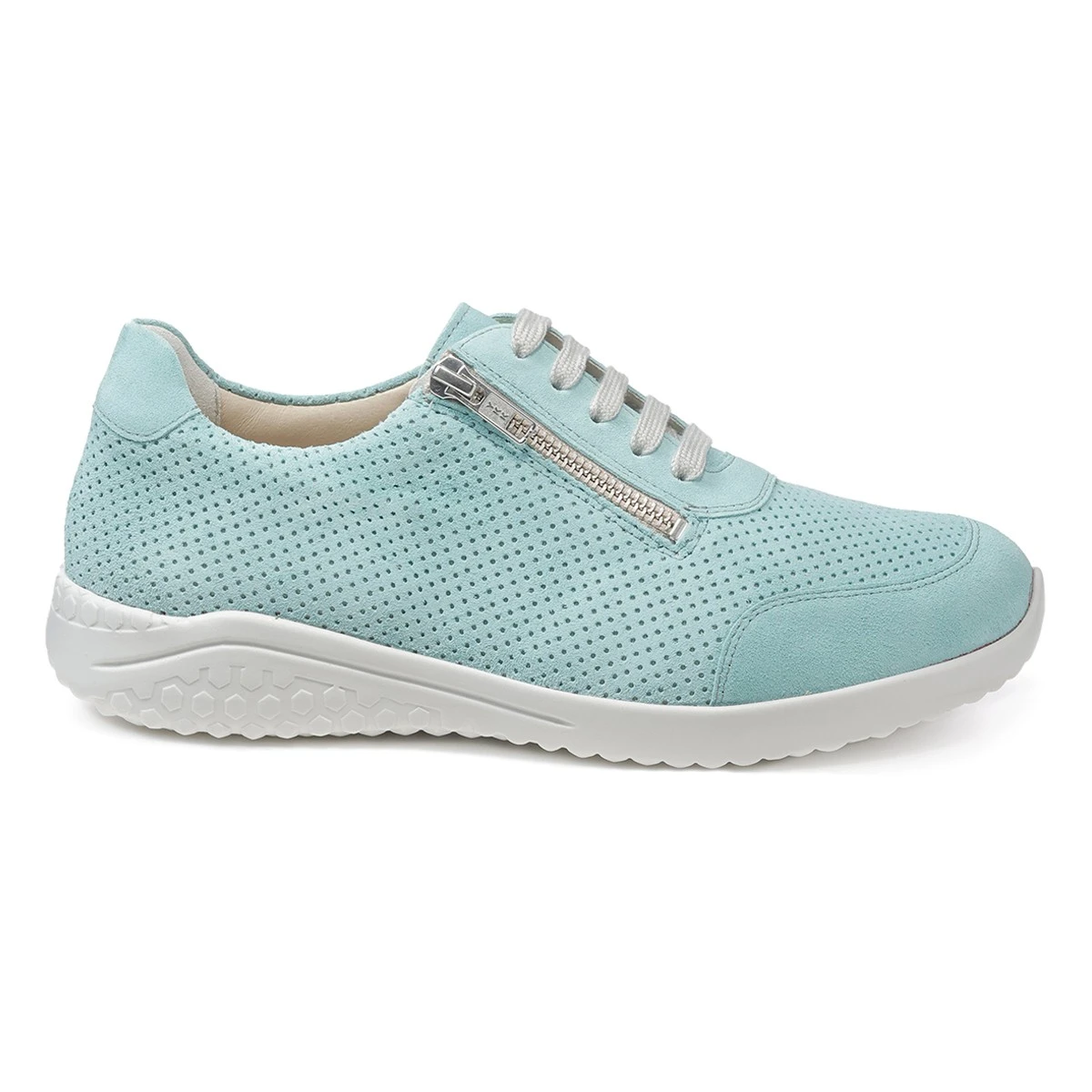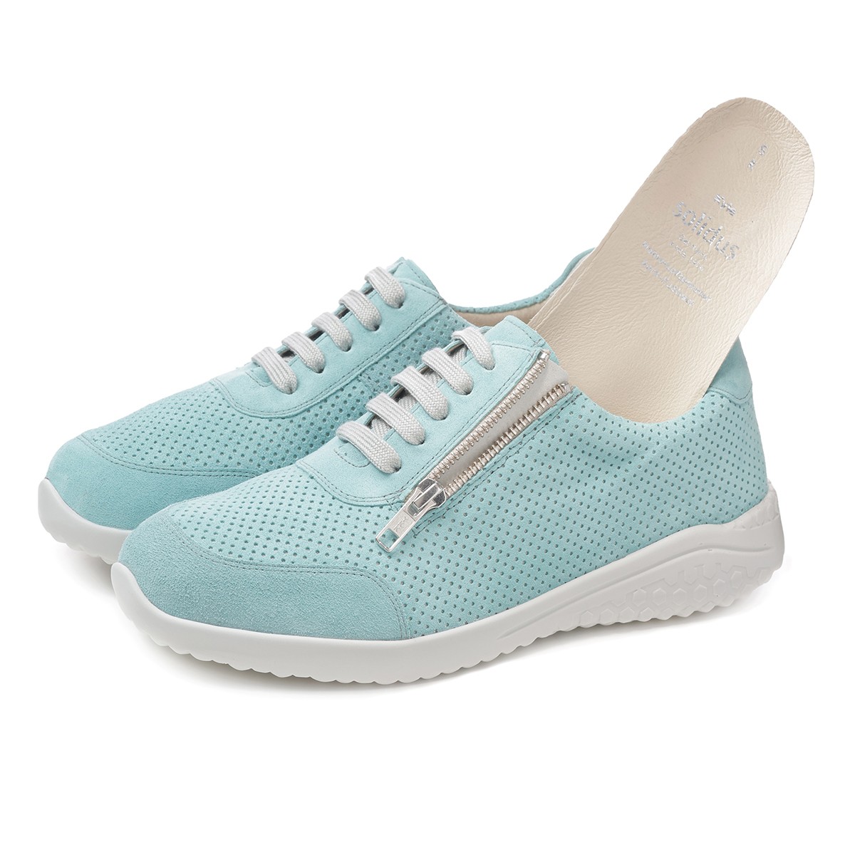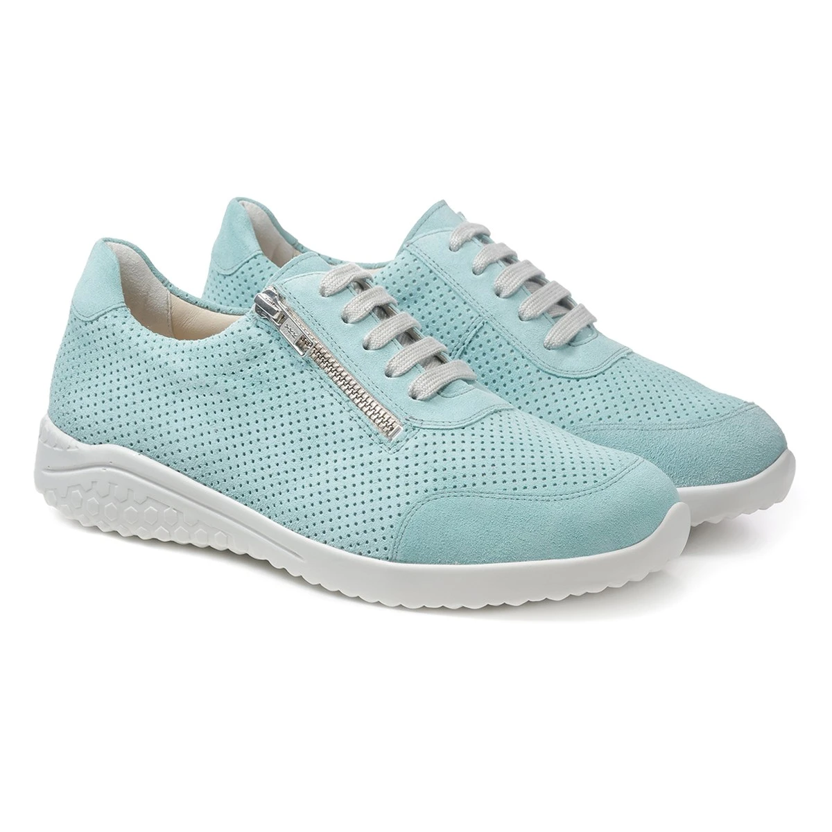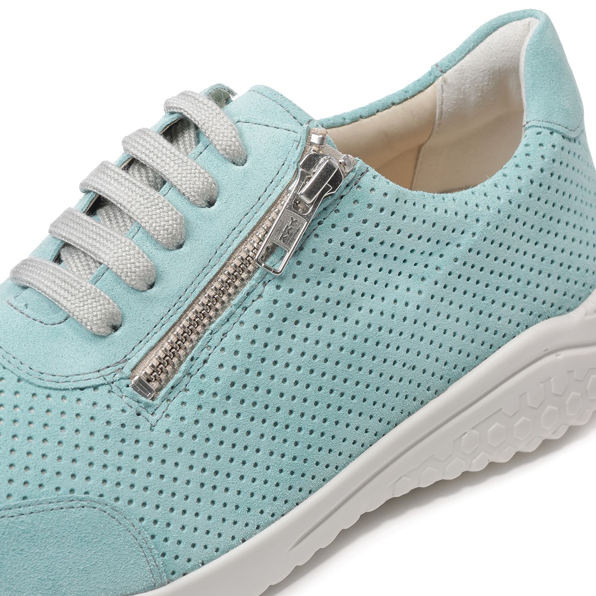 Мягкие и удобные кроссовки в нежно-бирюзовом оттенке сделают ваш образ более женственным. Модель выполнена из натуральной замши, имеет полноту К и подходит на широкую стопу и высокий подъем. Шнуровка позволяет отрегулировать полуботинки под собственные параметры, молния надежно зафиксирует обувь на ноге. Съемная стелька из пробкового дерева со вставками - амортизаторами поддерживает своды стопы. Перфорация способствует дополнительному воздухообмену, поэтому в такой обуви очень комфортно провести весь день.