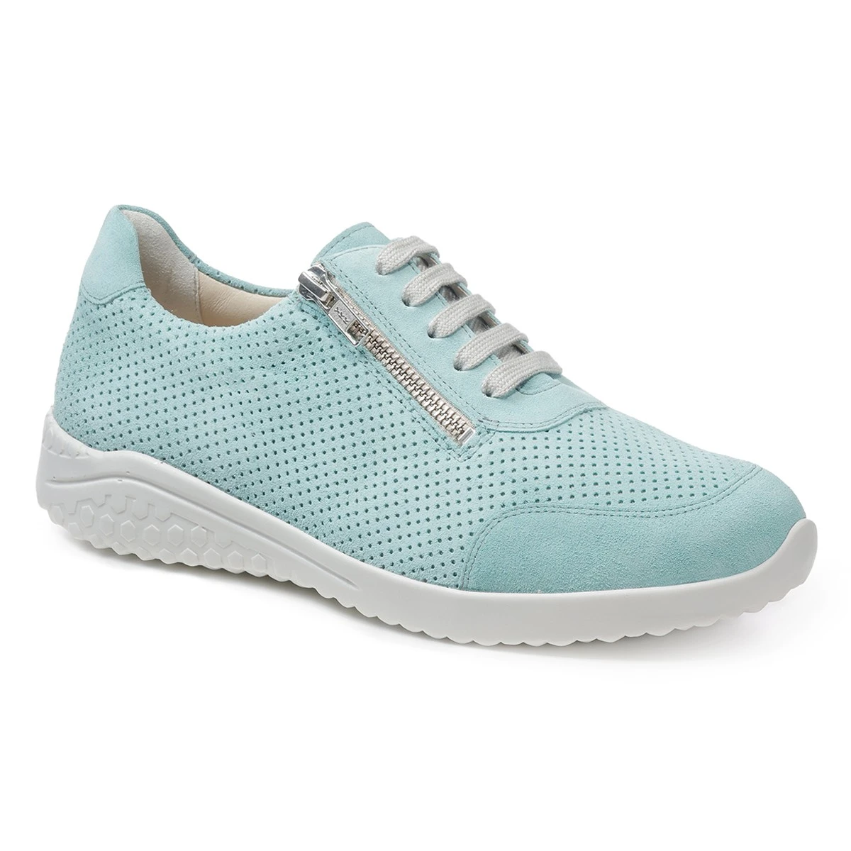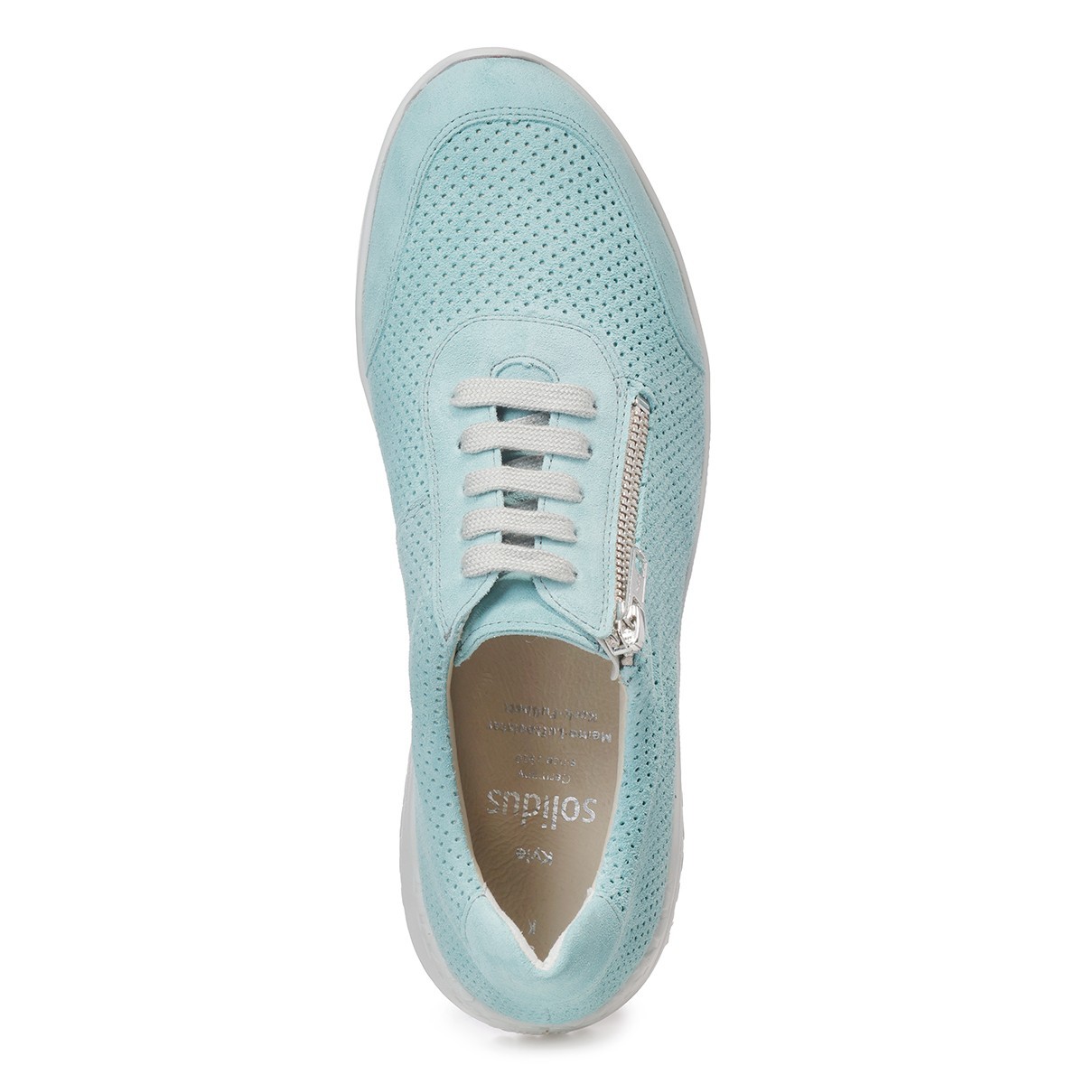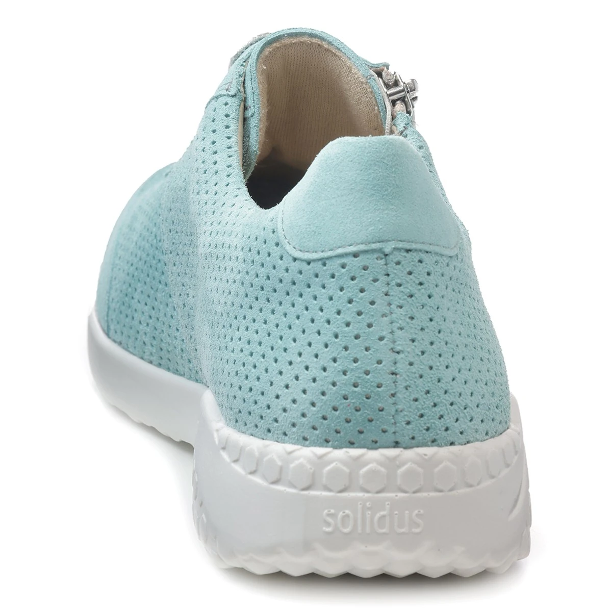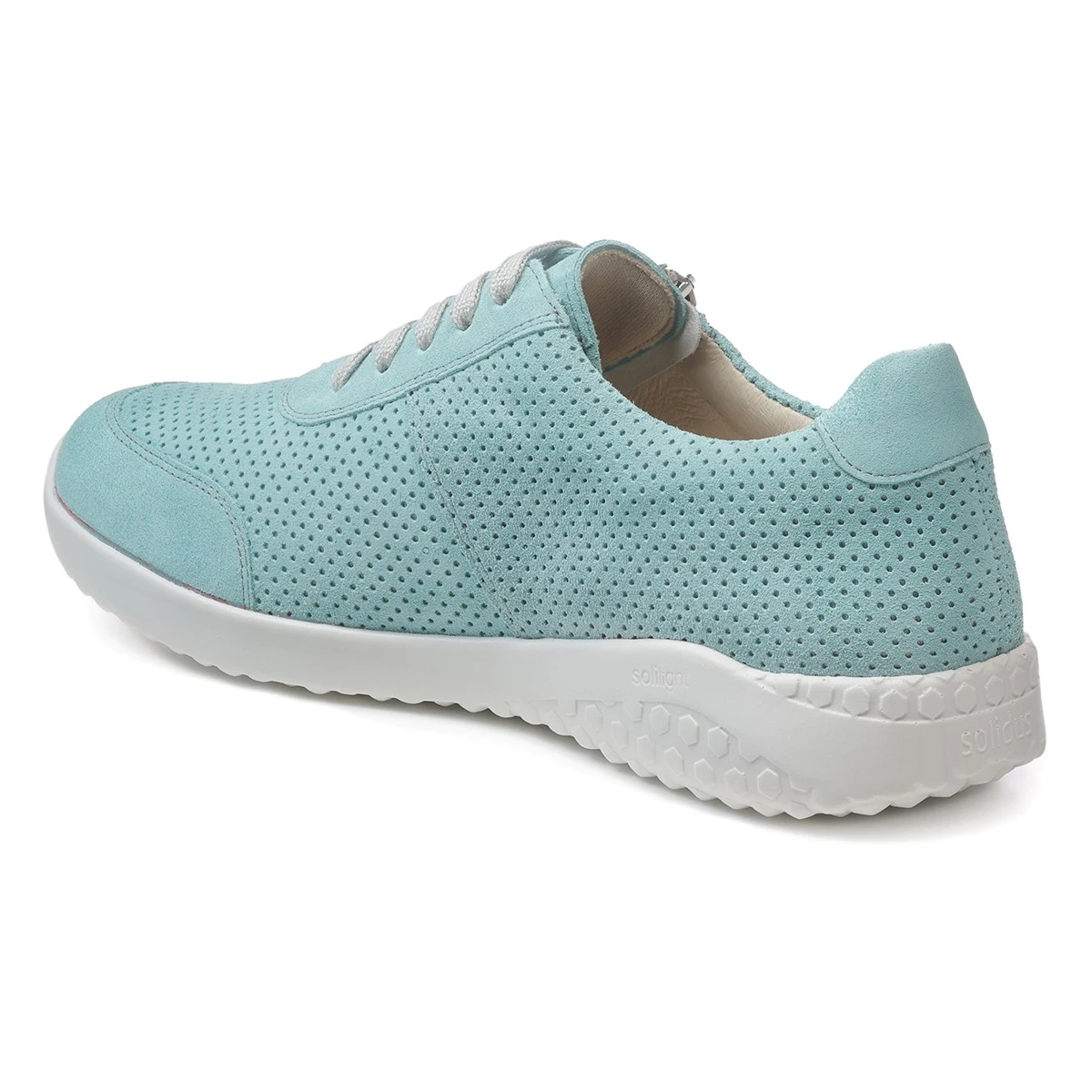 Мягкие и удобные кроссовки в нежно-бирюзовом оттенке сделают ваш образ более женственным. Модель выполнена из натуральной замши, имеет полноту К и подходит на широкую стопу и высокий подъем. Шнуровка позволяет отрегулировать полуботинки под собственные параметры, молния надежно зафиксирует обувь на ноге. Съемная стелька из пробкового дерева со вставками - амортизаторами поддерживает своды стопы. Перфорация способствует дополнительному воздухообмену, поэтому в такой обуви очень комфортно провести весь день.