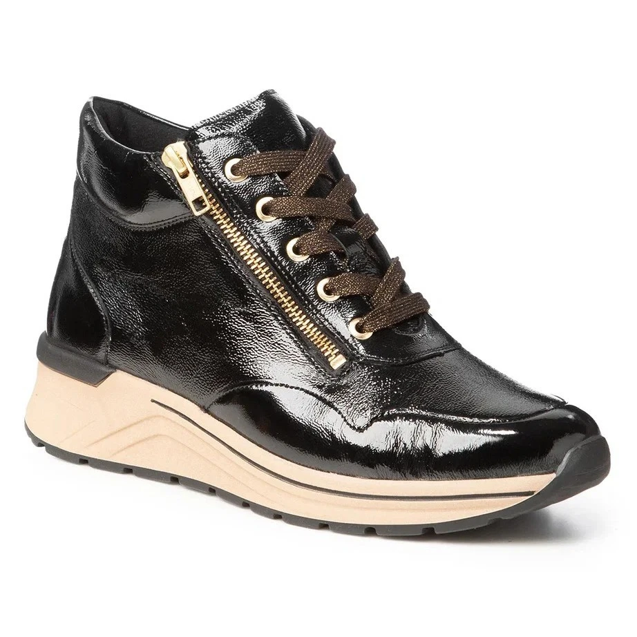 Стильные демисезонные кроссовки Solidus на колодке Karma Stiefel выполнены из натуральной лаковой кожи в практичном черном цвете. Золотистая металлическая фурнитура и бежевая массивная подошва удачно сочетаются с черным цветом модели.