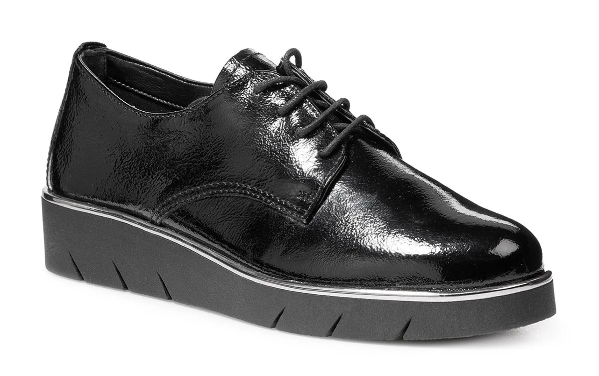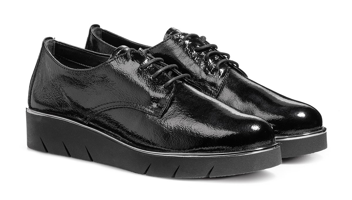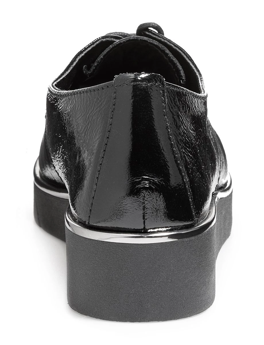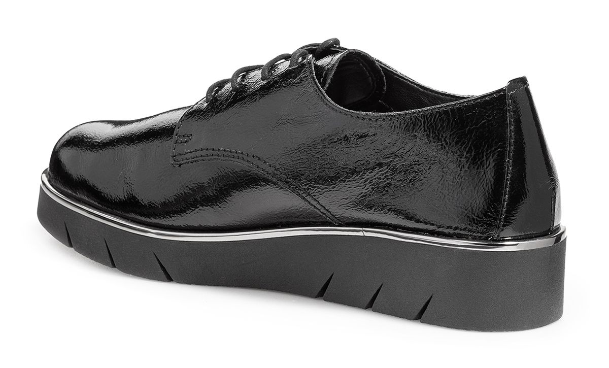 The FLEXX – это идеальная женская обувь, которая разрабатывается в итальянской Тоскане и производится в Европе из натуральной высококачественной кожи. Демисезонные полуботинки-дерби с лаковым покрытием и серебристой окантовкой прекрасно дополнят Ваш образ. Сочетание черного с серебром придает модели особую элегантность. Полуботинки выгодно отличаются своей универсальностью - подходят как для работы в офисе днем, так и для вечернего выхода. Благодаря шнуровке можно регулировать полноту. Если вечером ноги отекают, то есть возможность ослабить шнуровку. Удобная анатомическая колодка создает естественный перекат стопы и обеспечивает максимальный комфорт при ходьбе. Легкая, гибкая подошва обладает отличными амортизирующими свойствами и защищает стопы от чрезмерных ударных нагрузок во время ходьбы по жесткой поверхности.