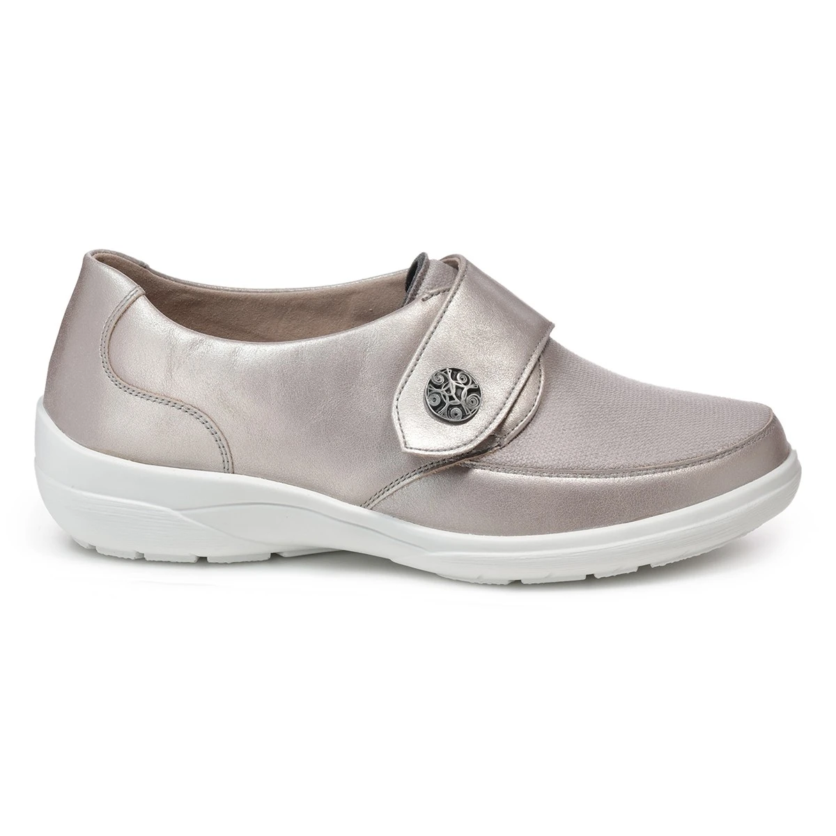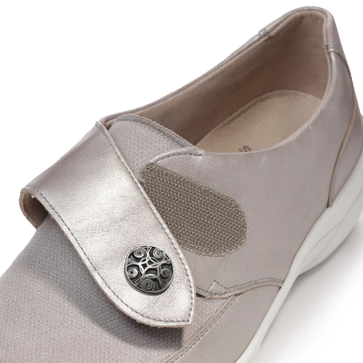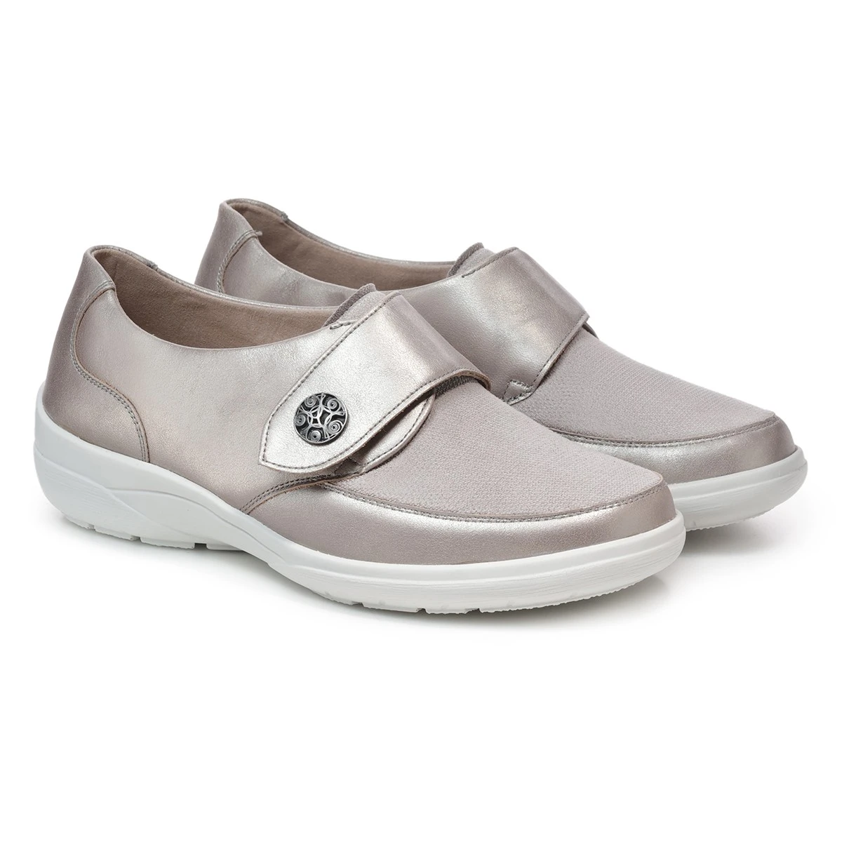 Сочетание кожи и эластичного материала с шикарным металлическим блеском придает обуви элегантный вид, благодаря чему она отлично сочетается с более изысканными нарядами. Приятный на ощупь материал подкладки обладает антибактериальными свойствами и легко моется. Застежку-липучку украшает красивая пуговица с заклепками.