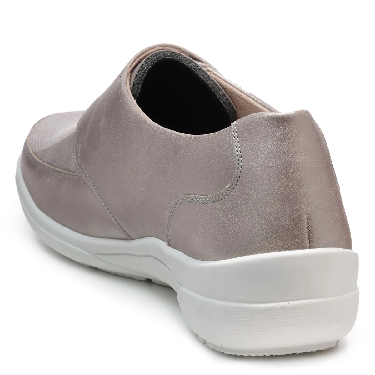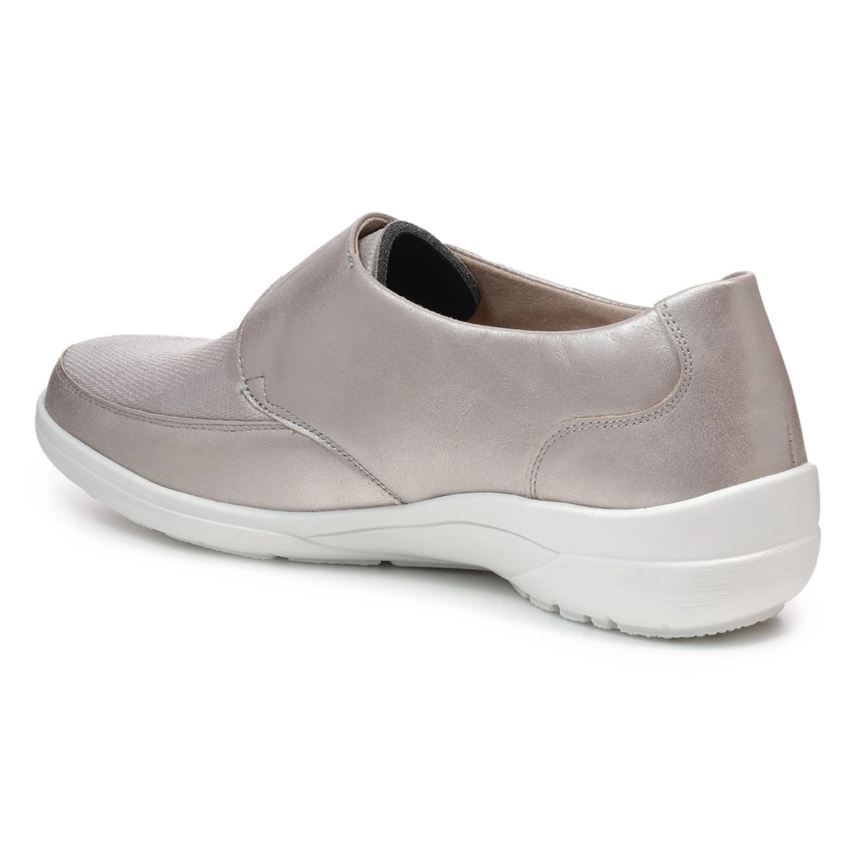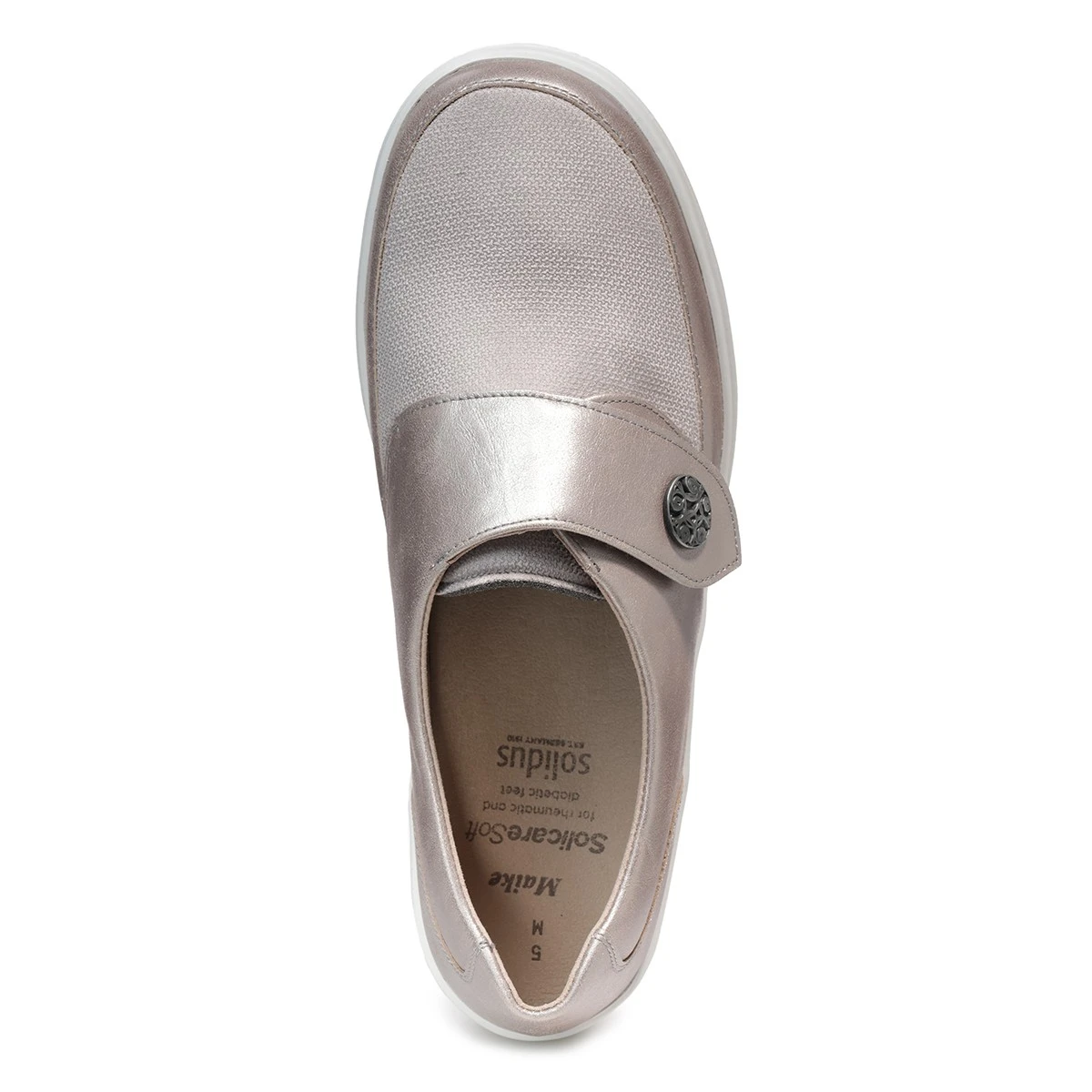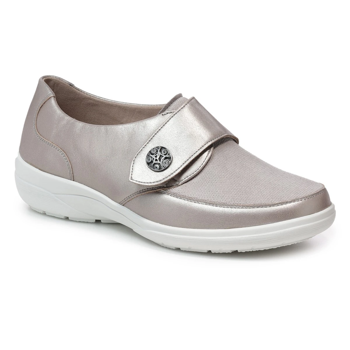 Сочетание кожи и эластичного материала с шикарным металлическим блеском придает обуви элегантный вид, благодаря чему она отлично сочетается с более изысканными нарядами. Приятный на ощупь материал подкладки обладает антибактериальными свойствами и легко моется. Застежку-липучку украшает красивая пуговица с заклепками.
