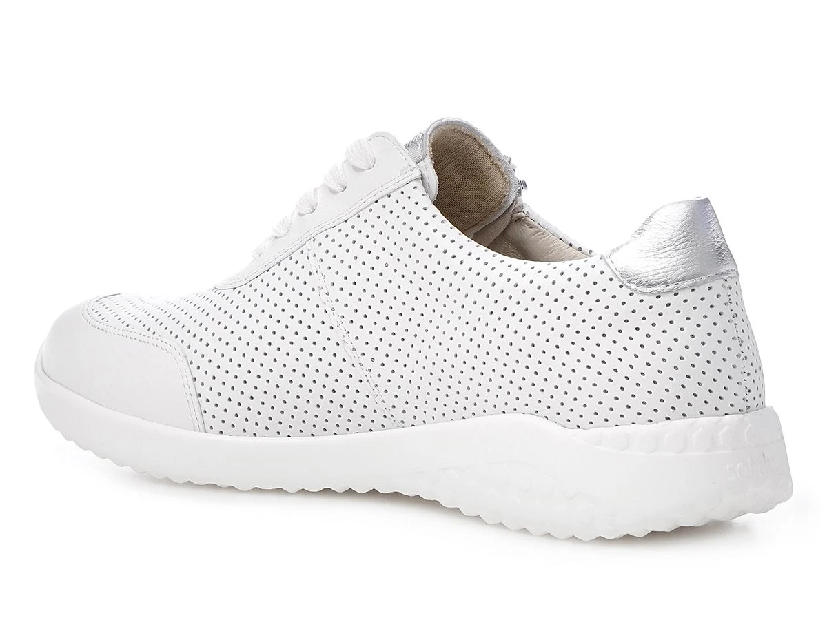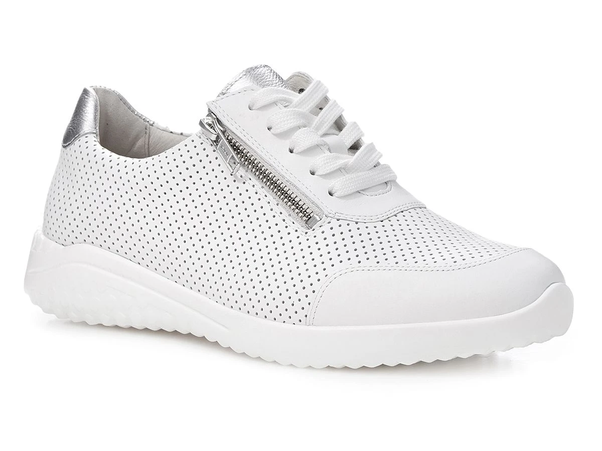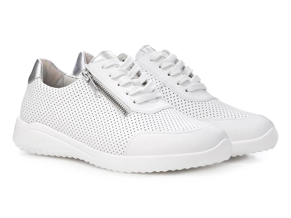 В обуви двойная система фиксации: шнурки и молния облегчают регулировку и надевание. Белые кроссовки – это классика и всегда любимая пара в женском гардеробе, они гармонично сочетаются с джинсами, брюками и юбками.