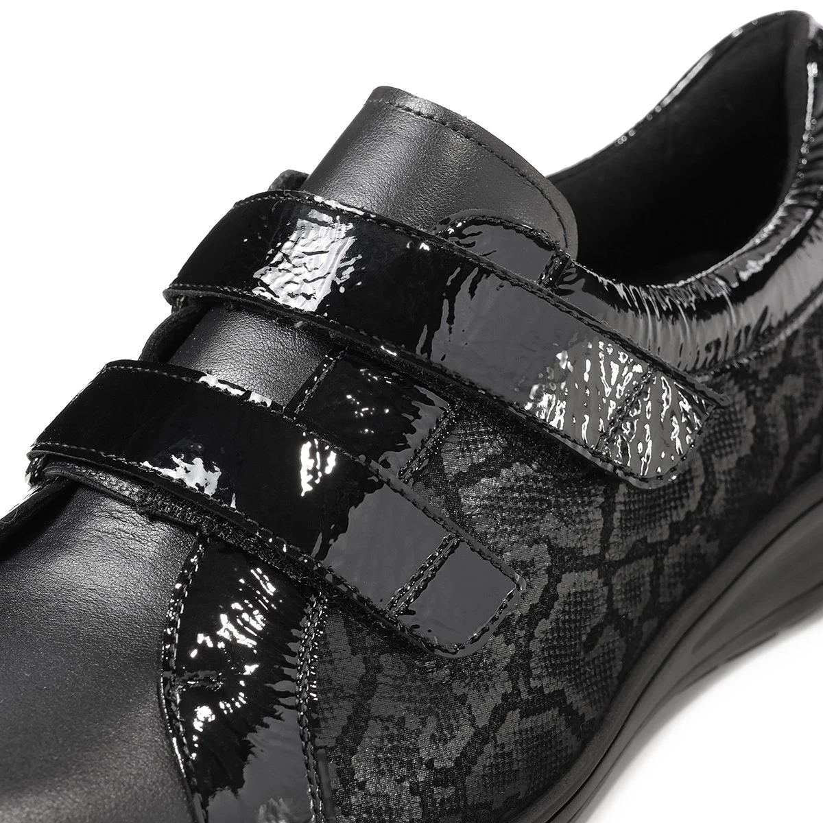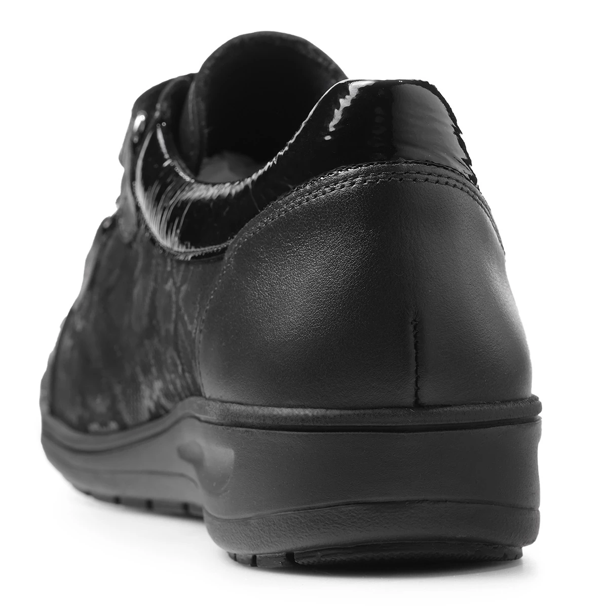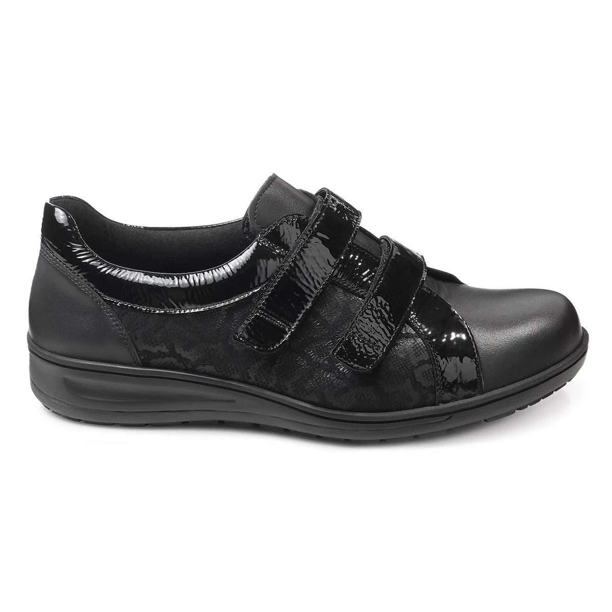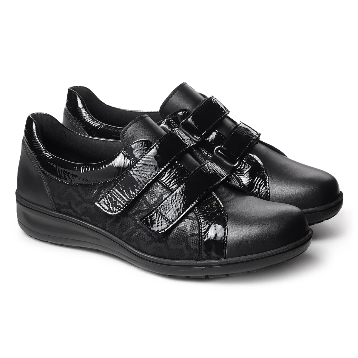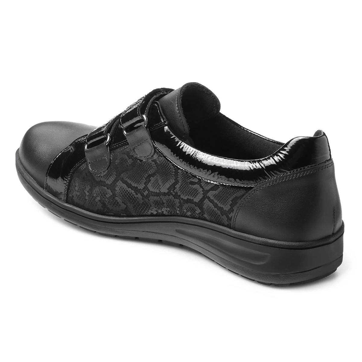 Представляем новинку – черные демисезонные полуботинки, выполненные из натуральной кожи разных фактур. Гладкая, лаковая кожа и кожа с анималистичным принтом под питона придают модели динамичности. Обувь подходит на широкую стопу и высокий подъем, два ремешка с застежкой-липучкой быстро и надежно фиксируют полуботинки по ноге.
