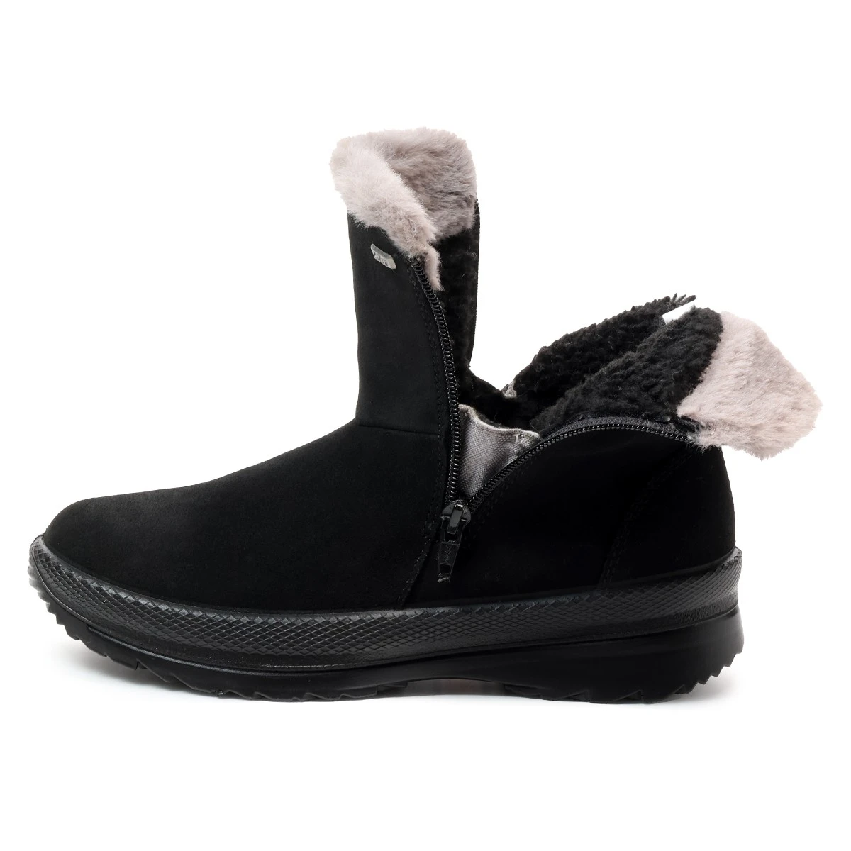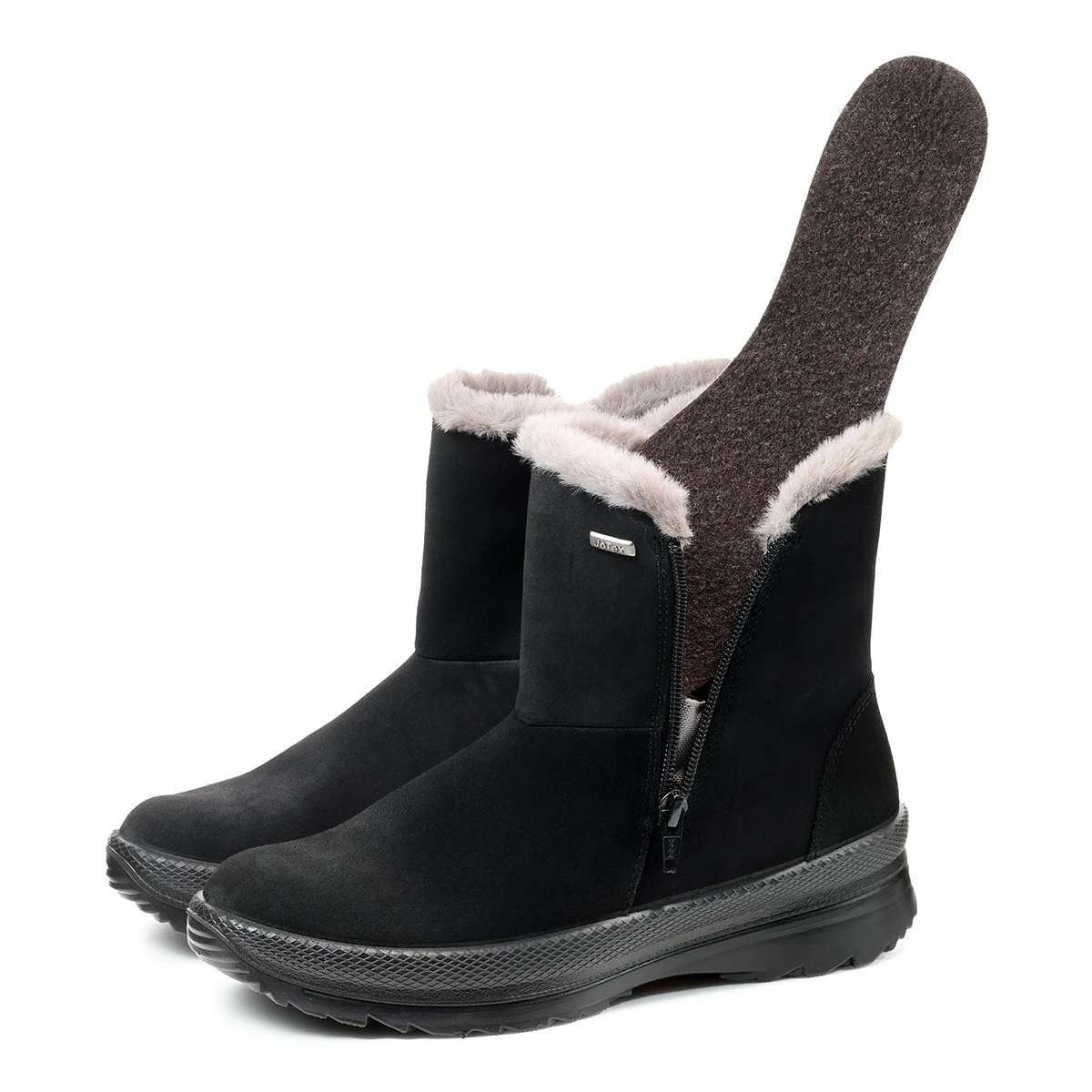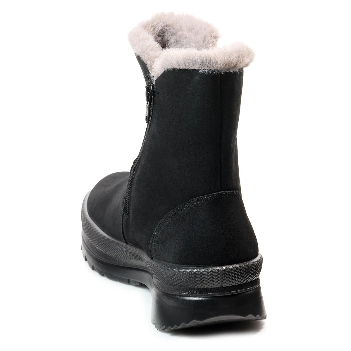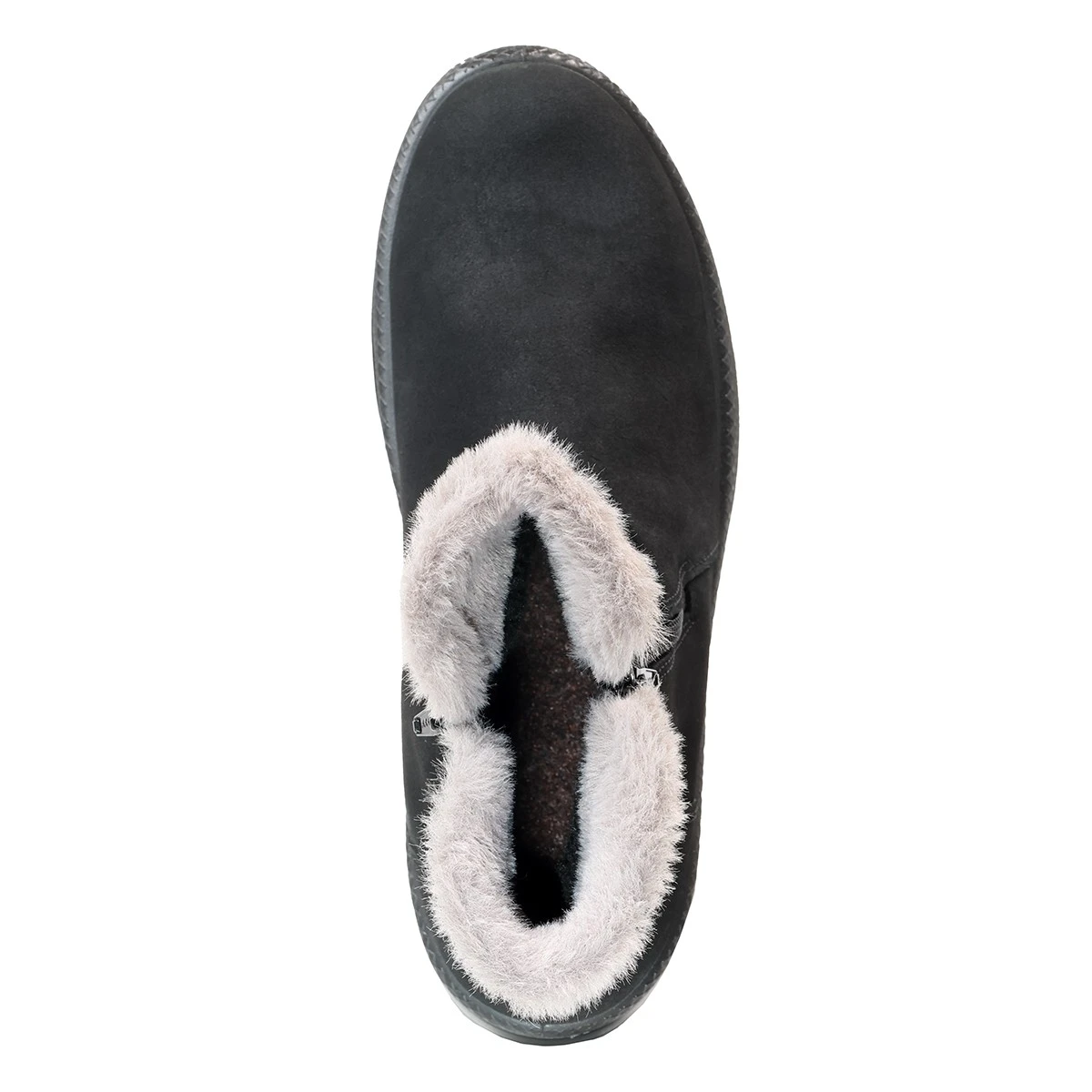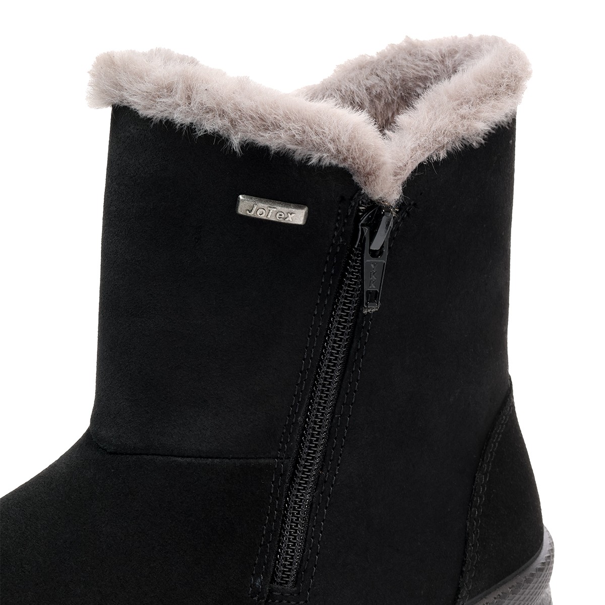 Уютные полусапожки из мягкой натуральной замши практичного черного оттенка с опушкой из искусственного меха в увеличенной полноте H - то, что нужно для тех, кто начинает мерзнуть еще до прихода зимы. Водонепроницаемая мембрана и подкладка из шерстяной байки позволяют носить обувь зимой при умеренном климате. Две молнии полностью раскрывают обувь, облегчая процесс надевания. Мягкая и гибкая подошва собственной разработки Jomos благодаря небольшому весу придает обуви приятную легкость.