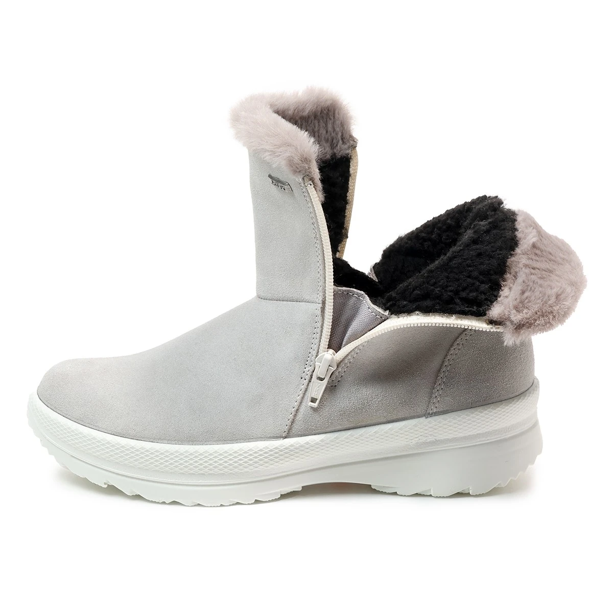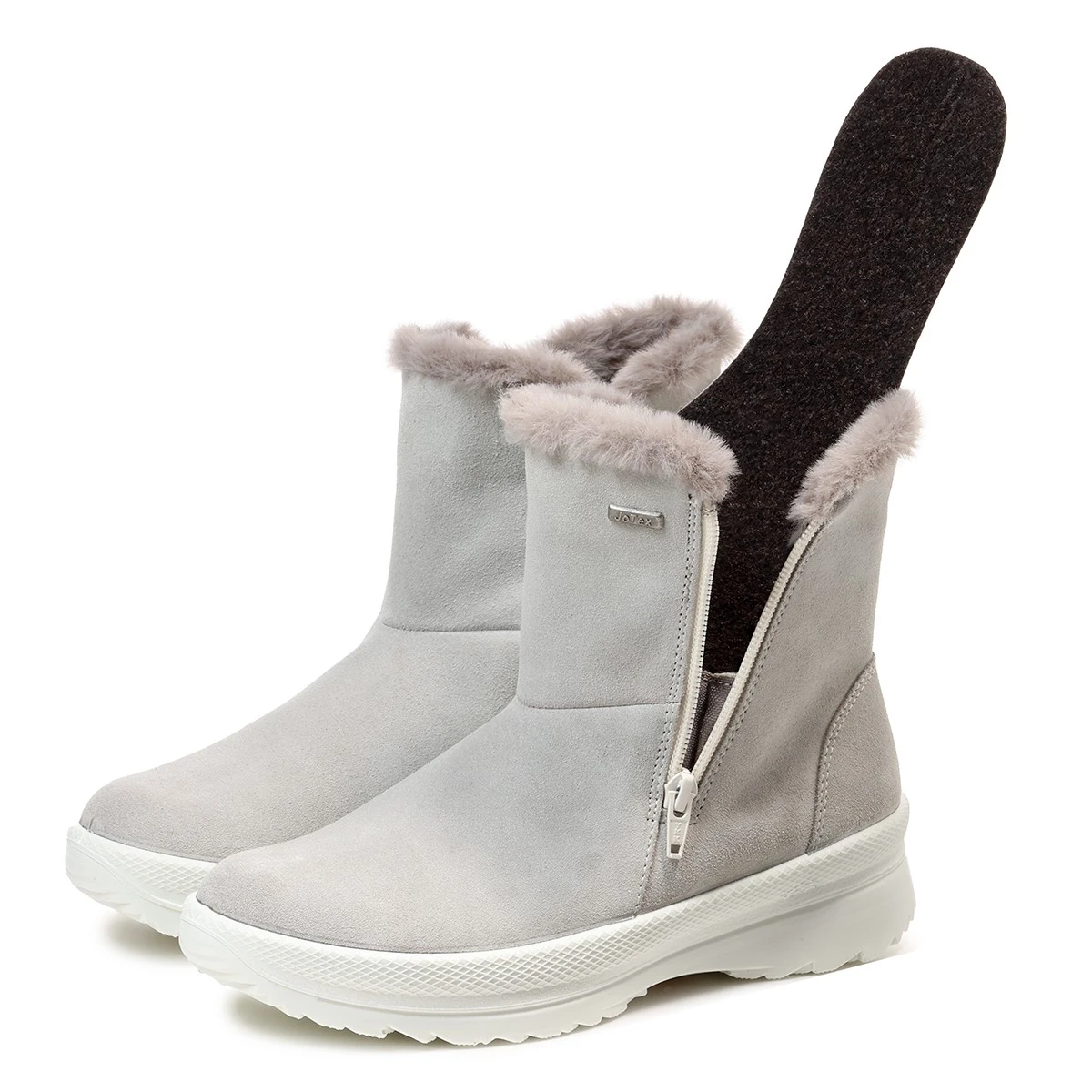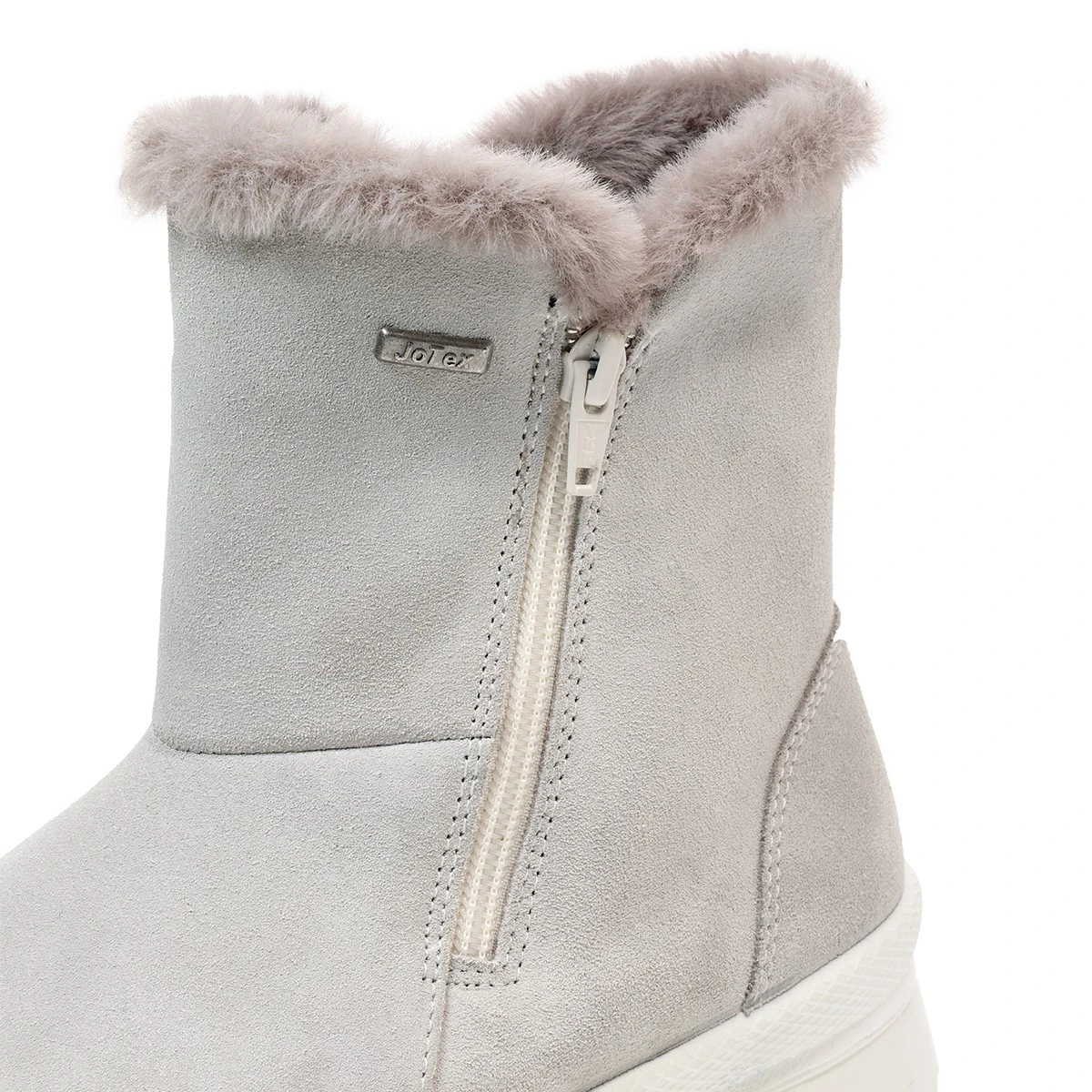 Уютные полусапожки из мягкой натуральной замши светло-серого оттенка с опушкой из искусственного меха в увеличенной полноте H -  то, что нужно для тех, кто начинает мерзнуть еще до прихода зимы.  Водонепроницаемая мембрана и подкладка из шерстяной байки позволяют носить обувь зимой при умеренном климате. Две молнии полностью раскрывают обувь, облегчая процесс надевания. Мягкая и гибкая подошва собственной разработки Jomos благодаря небольшому весу придает обуви приятную легкость.