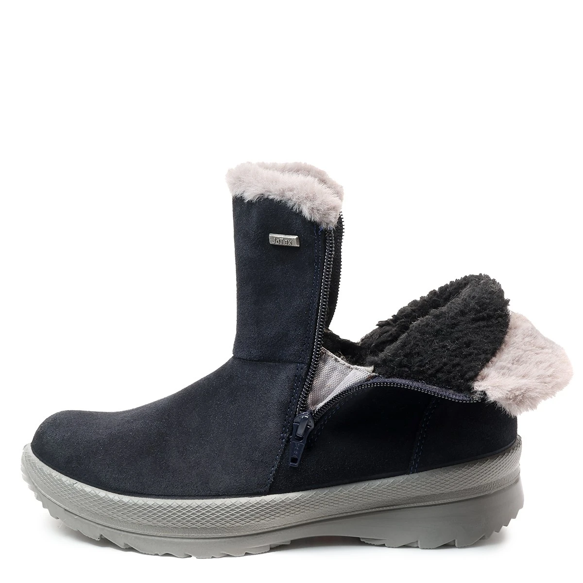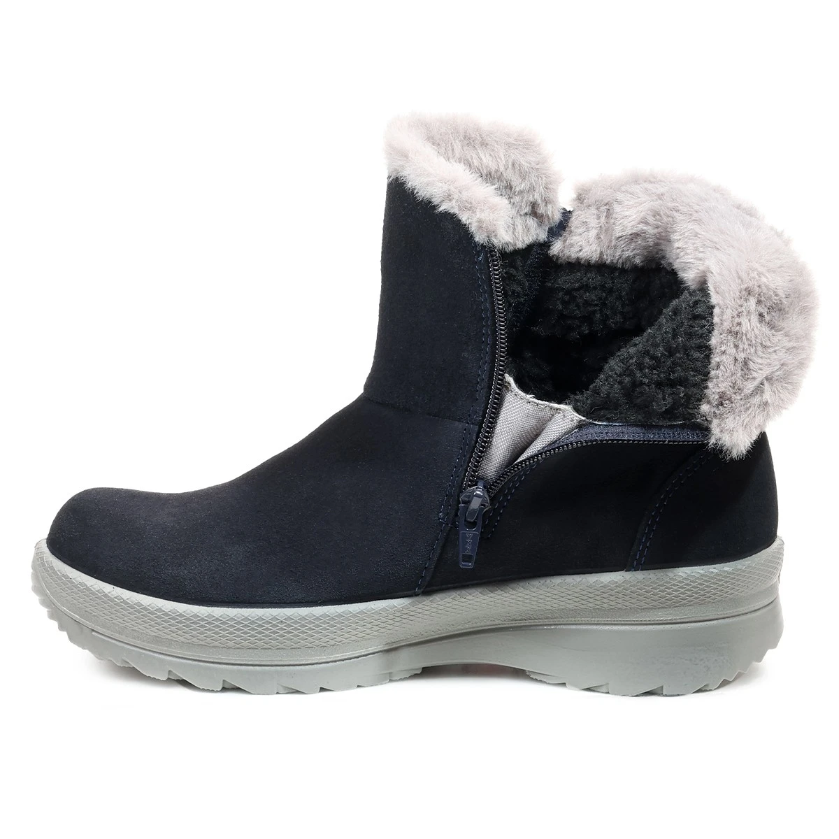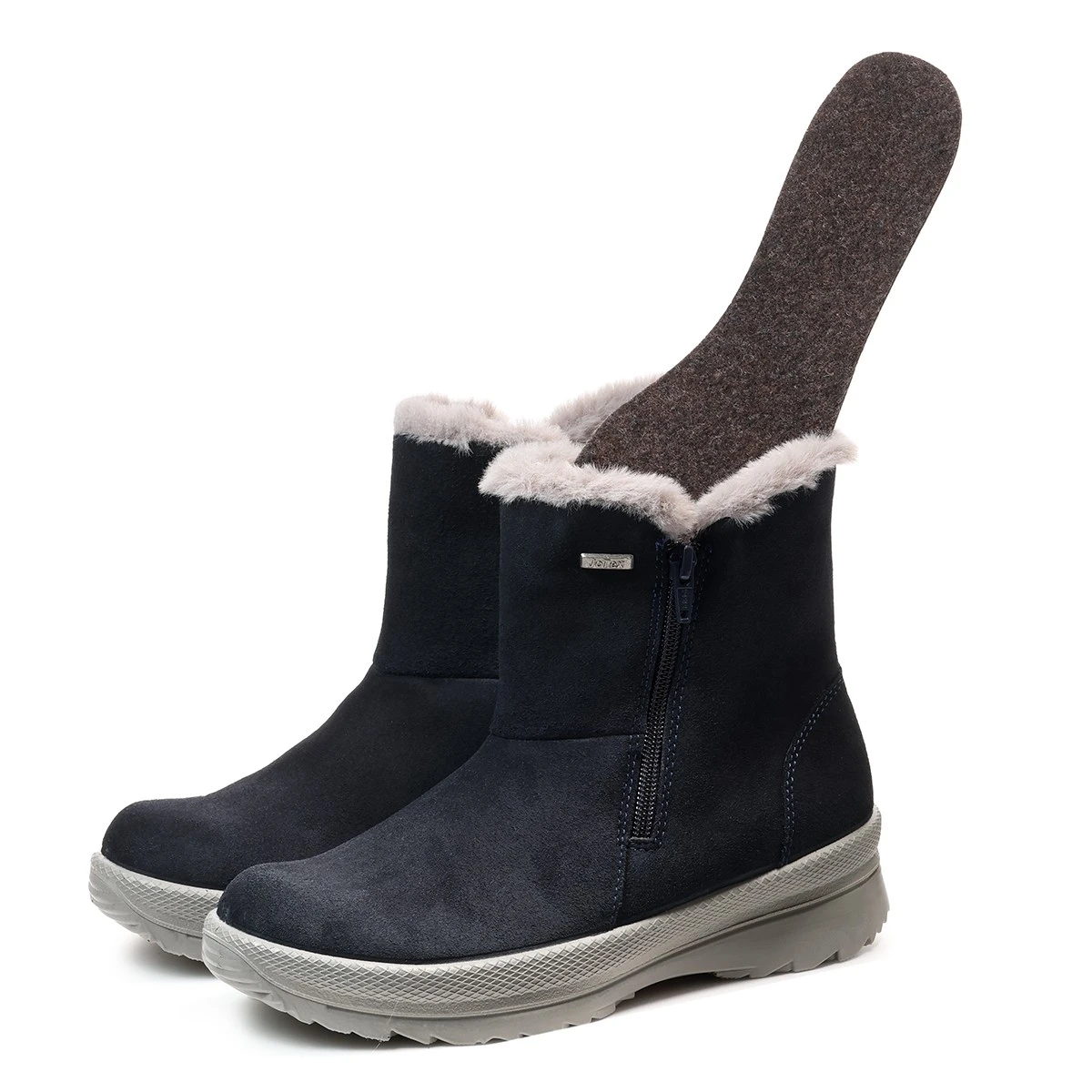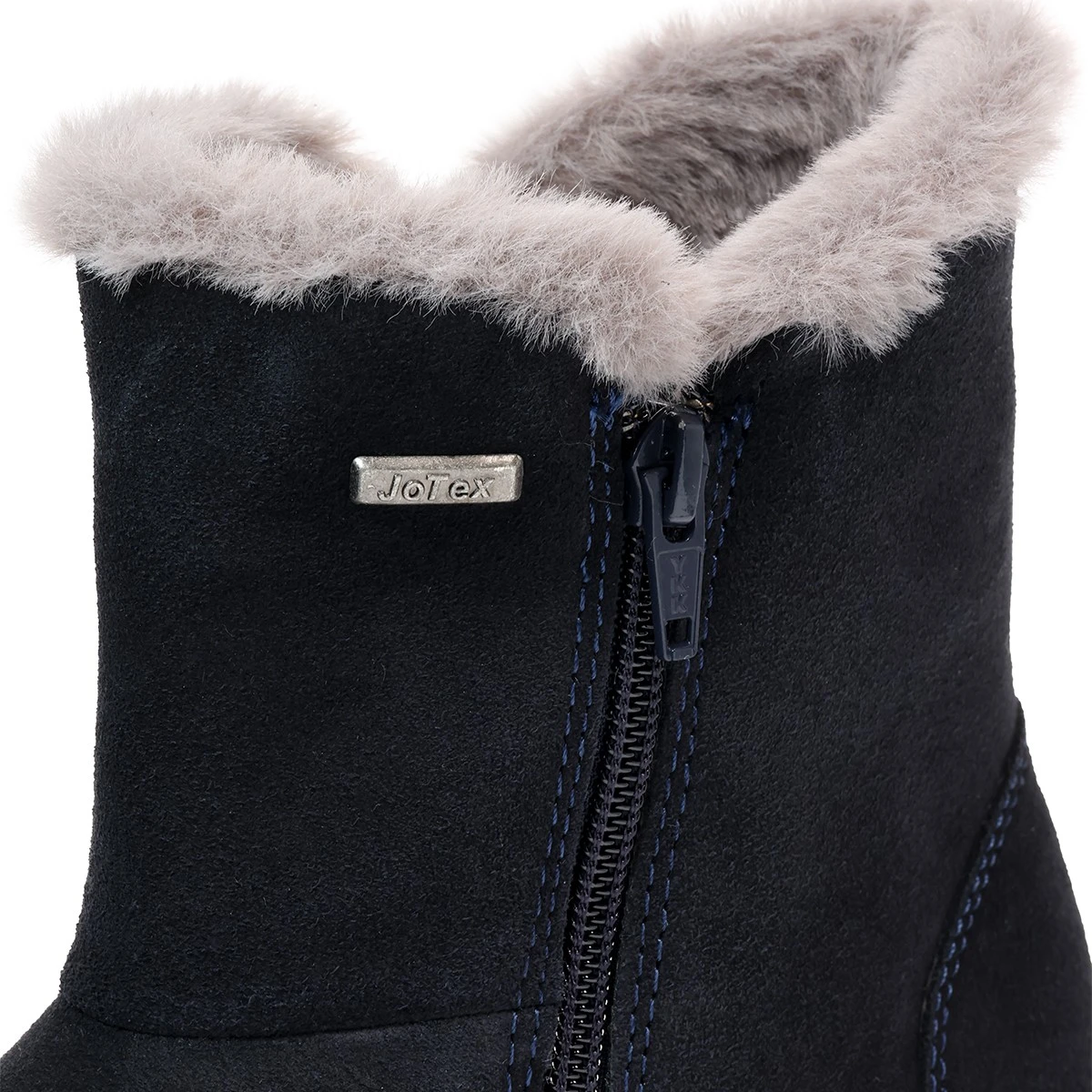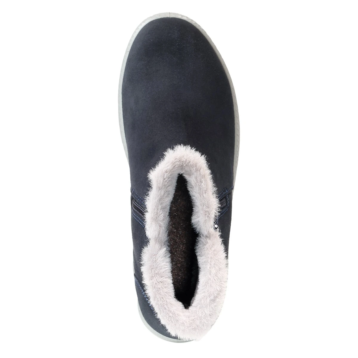 Уютные полусапожки из мягкой натуральной замши синего оттенка с опушкой из искусственного меха в увеличенной полноте H - то, что нужно для тех, кто начинает мерзнуть еще до прихода зимы. Водонепроницаемая мембрана и подкладка из шерстяной байки позволяют носить обувь зимой при умеренном климате. Две молнии полностью раскрывают обувь, облегчая процесс надевания. Мягкая и гибкая подошва собственной разработки Jomos благодаря небольшому весу придает обуви приятную легкость.
