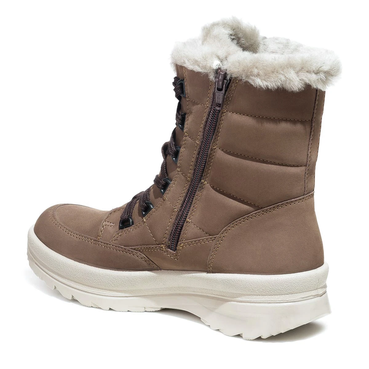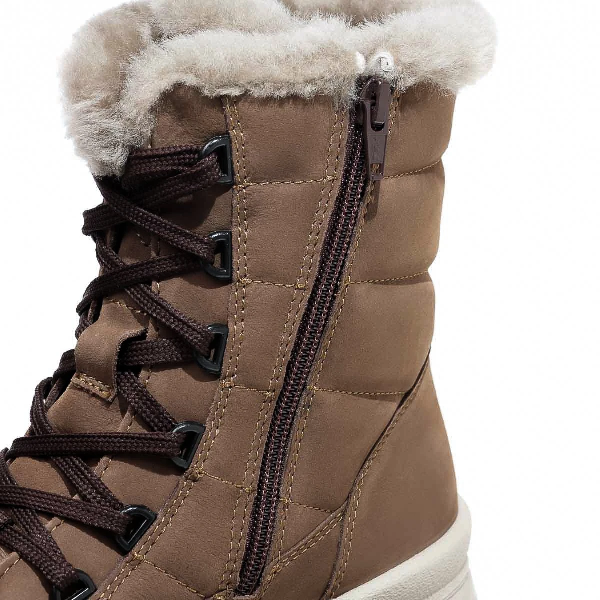 Зимние женские полусапожки выполнены из мягкого и прочного натурального нубука, украшены меховой опушкой по верхнему краю. Модель утеплена овечьим мехом, который прекрасно согревает в холодную погоду. Для максимального удобства женские полусапожки оснащены двойной застежкой - шнуровкой и молнией, которые максимально облегчают надевание и регулировку по стопе.