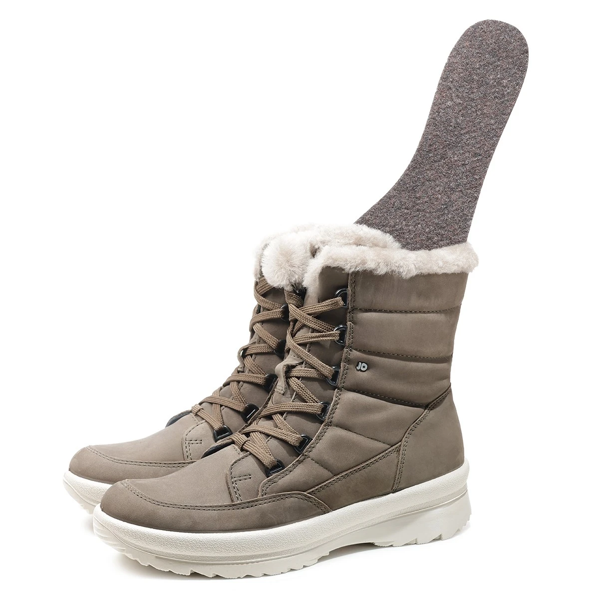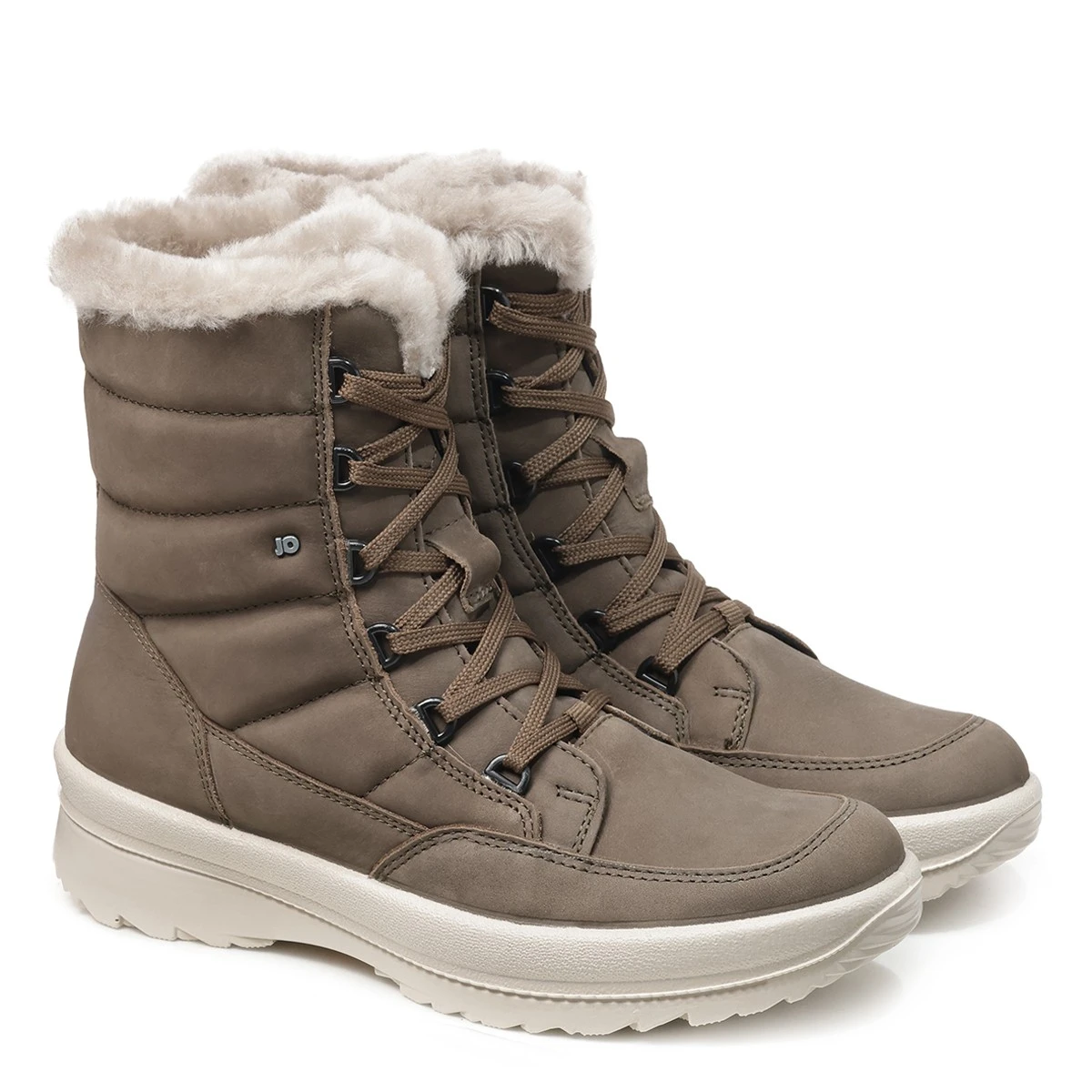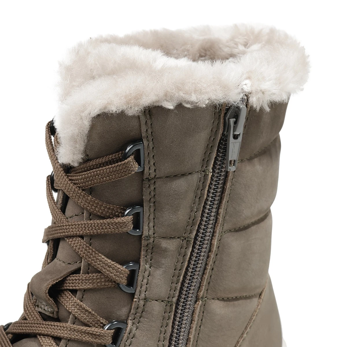 Зимние полусапоги выполнены из мягкого и прочного натурального нубука оливкового оттенка. Опушка из натурального меха украшает модель. Натуральный овечий мех подкладки согреет в холодную погоду.