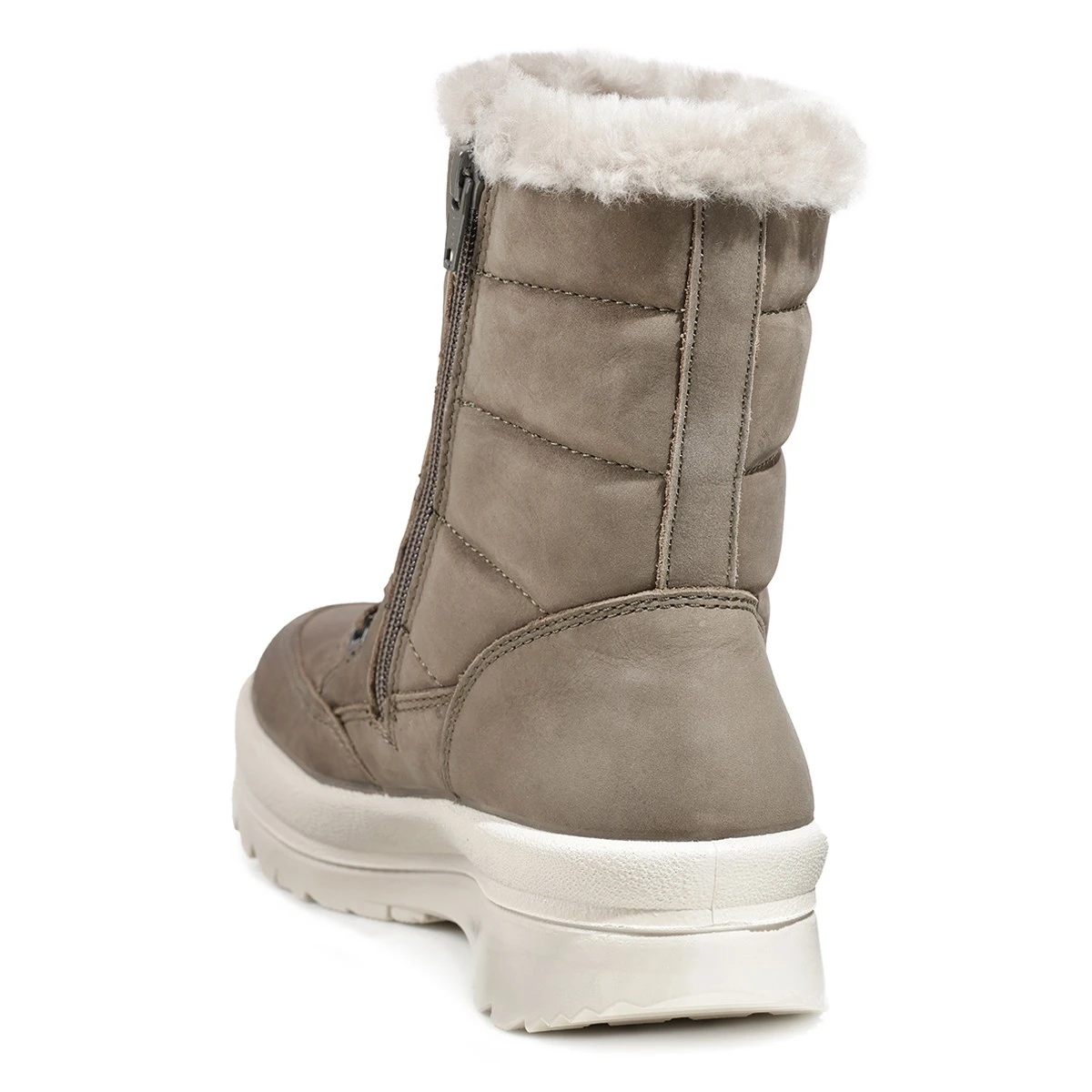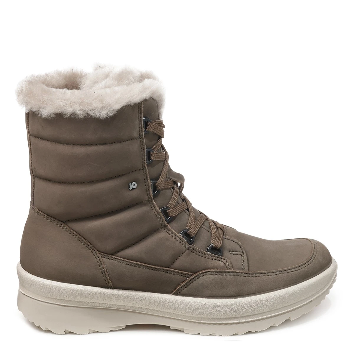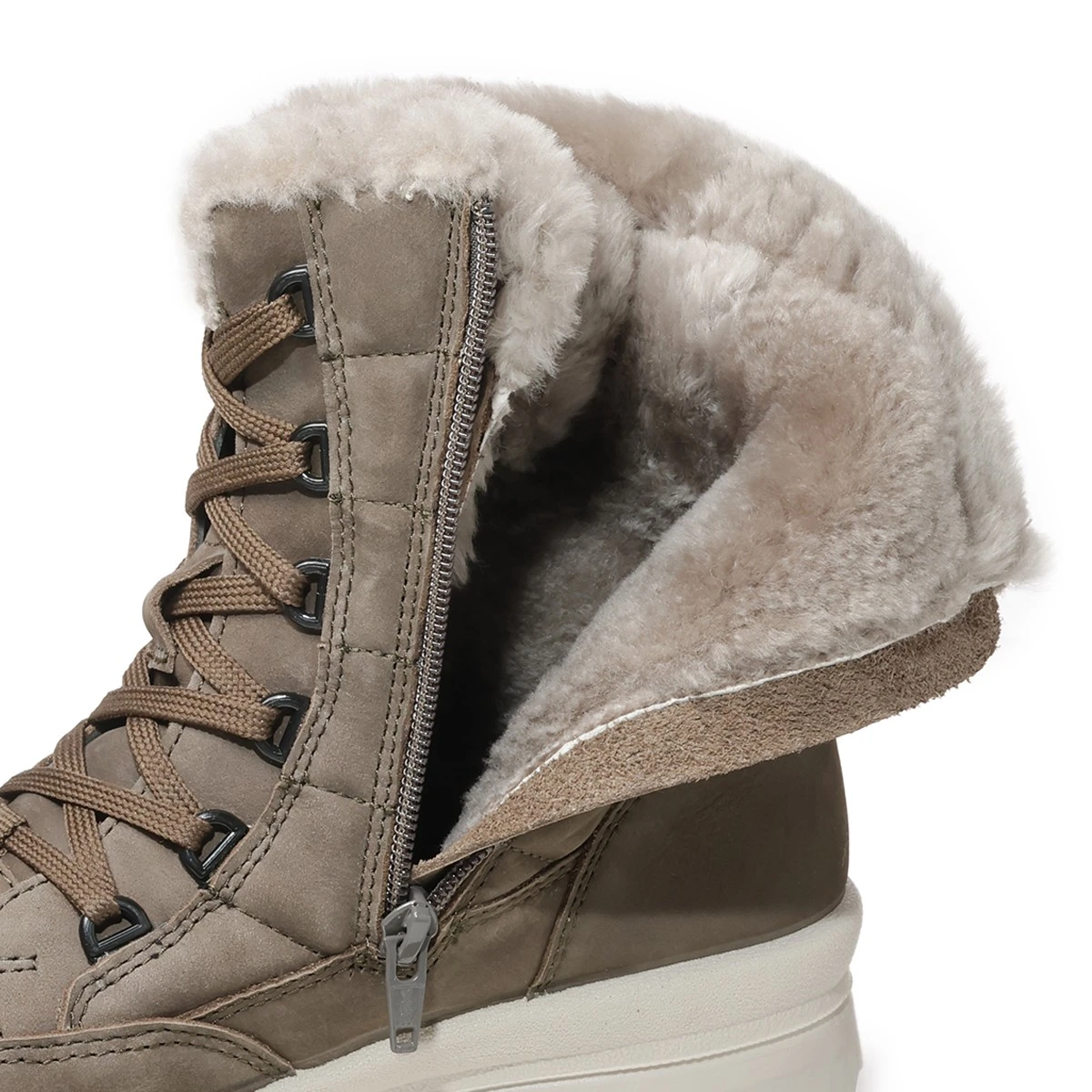 Зимние полусапоги выполнены из мягкого и прочного натурального нубука оливкового оттенка. Опушка из натурального меха украшает модель. Натуральный овечий мех подкладки согреет в холодную погоду.