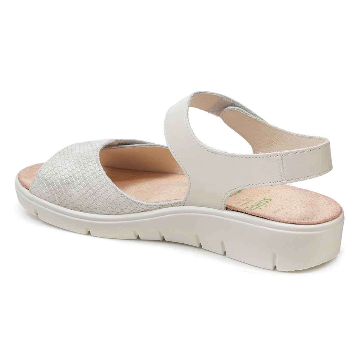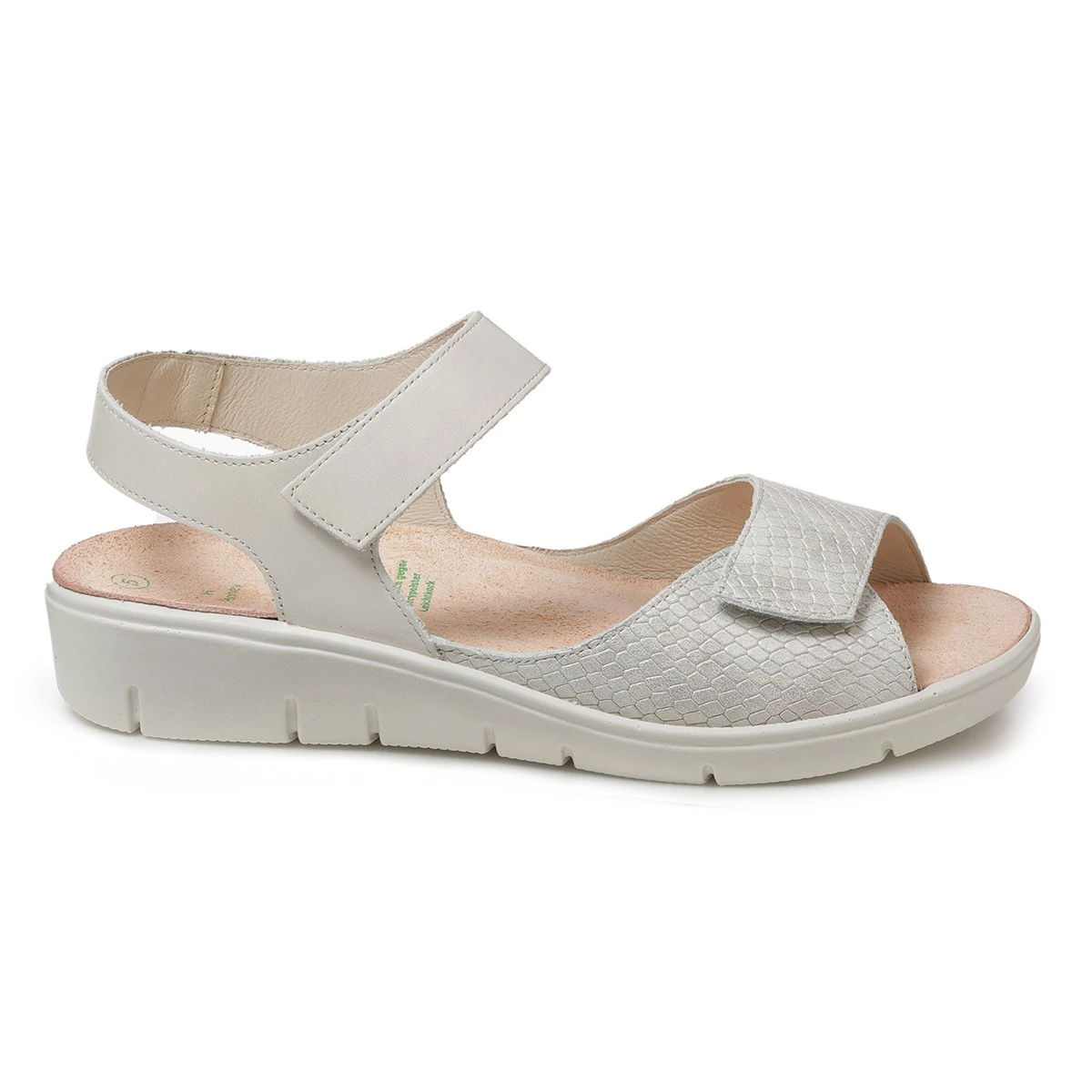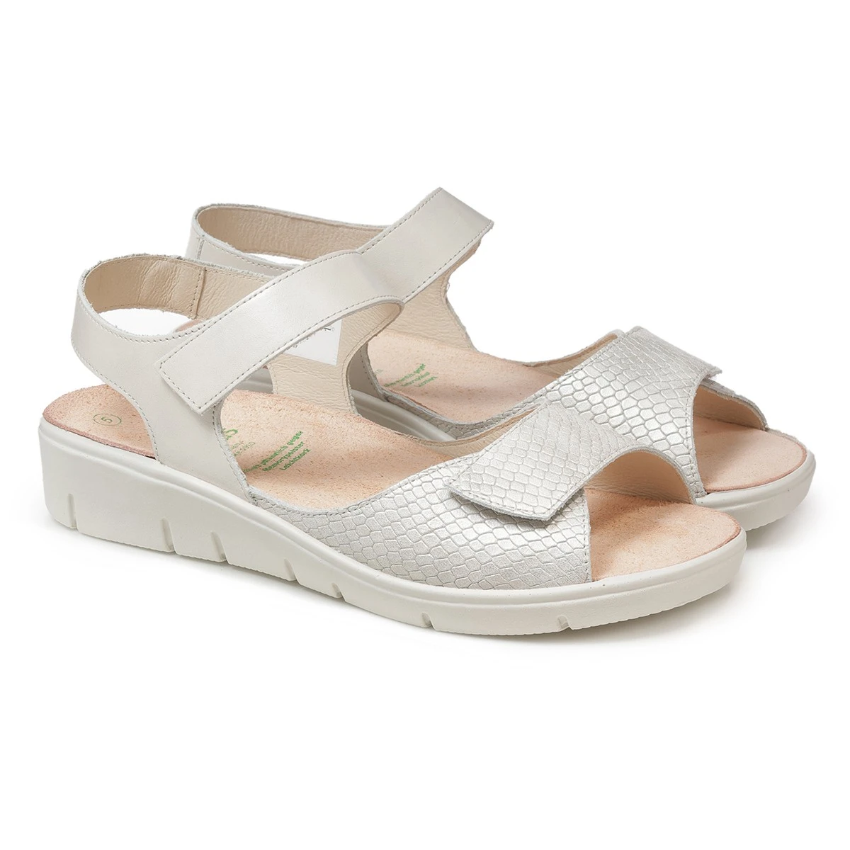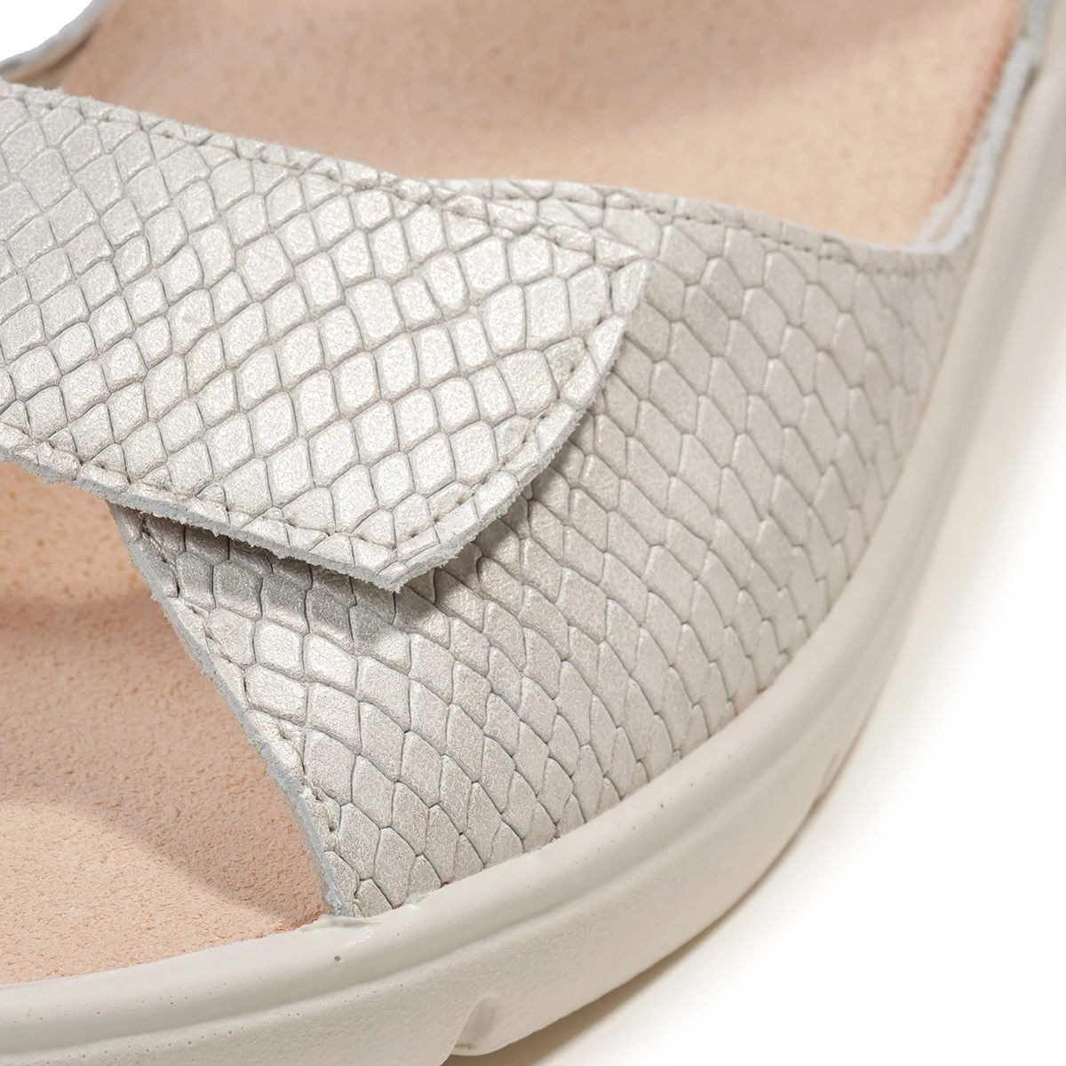 Светлые сандалии в увеличенной полноте выполнены из натуральной гладкой кожи в комбинации с принтованной под рептилию, деликатный блеск которой понравится многим модницам. Модель идеальна как для повседневной носки на работу, так и для продолжительных летних прогулок и путешествий.