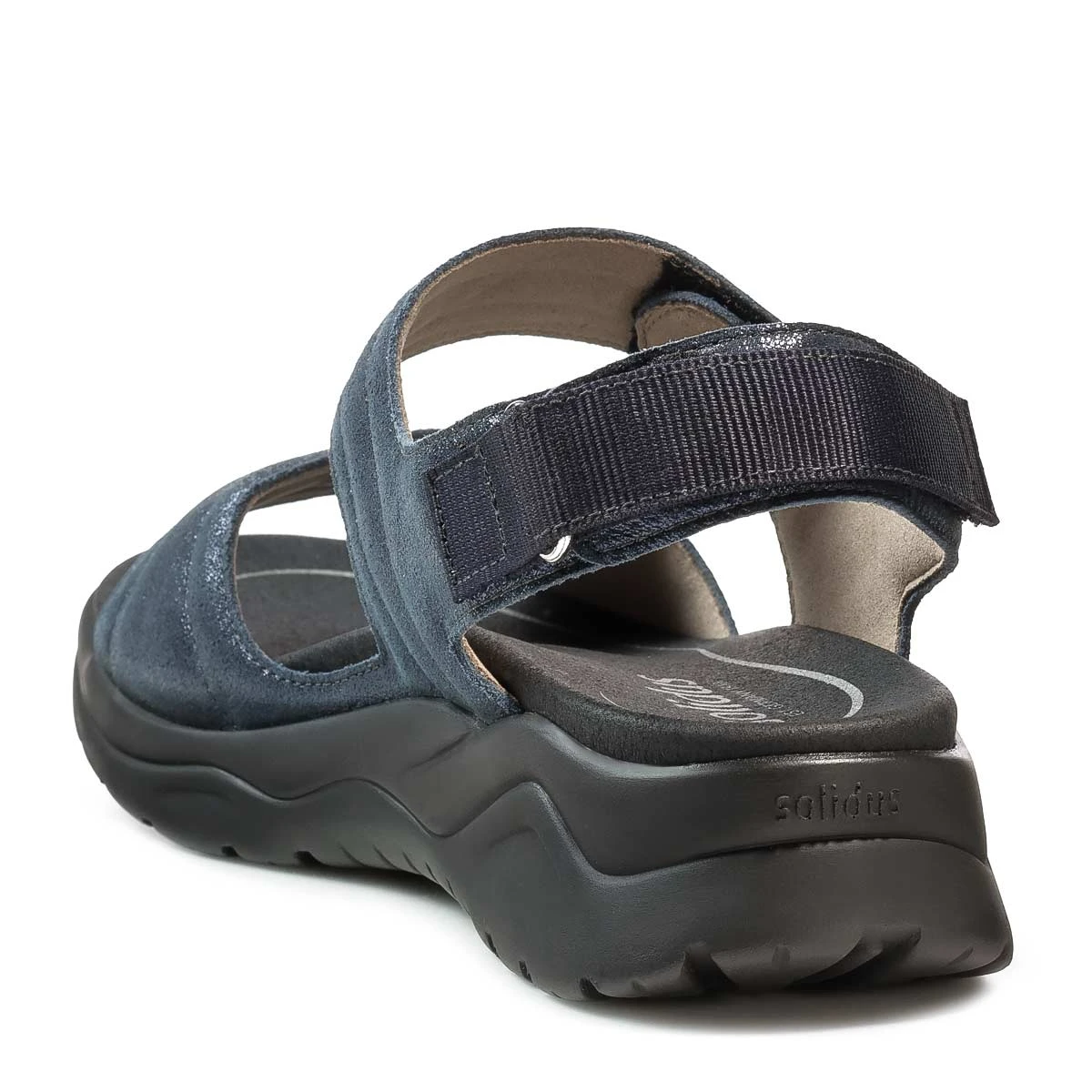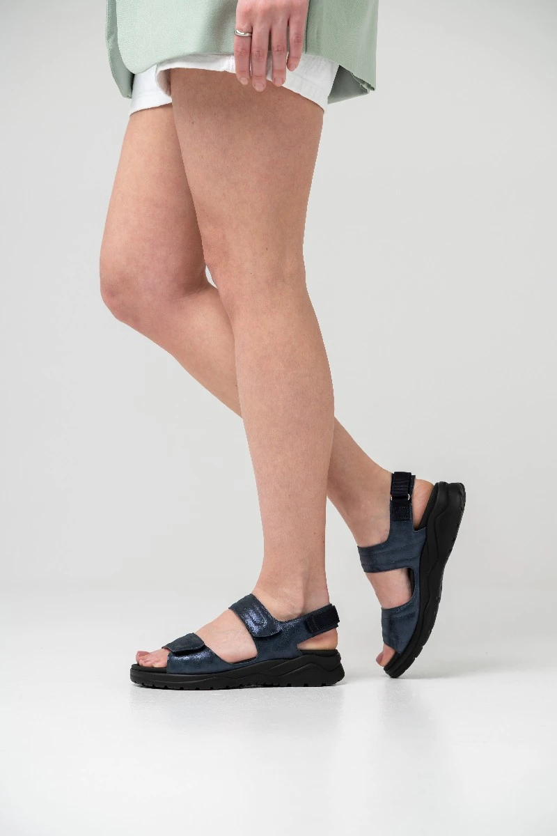Женские сандалии в темно-синем оттенке и на удобном каблуке (3,8 см в подпяточной зоне) сделают силуэт визуально стройнее, поддержат расслабленный образ выходного дня. Открытая модель будет незаменима на жаркий сезон, подойдет к повседневному образу или спорт-шик.