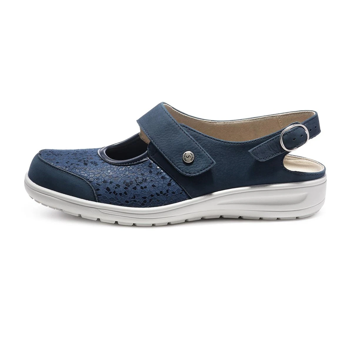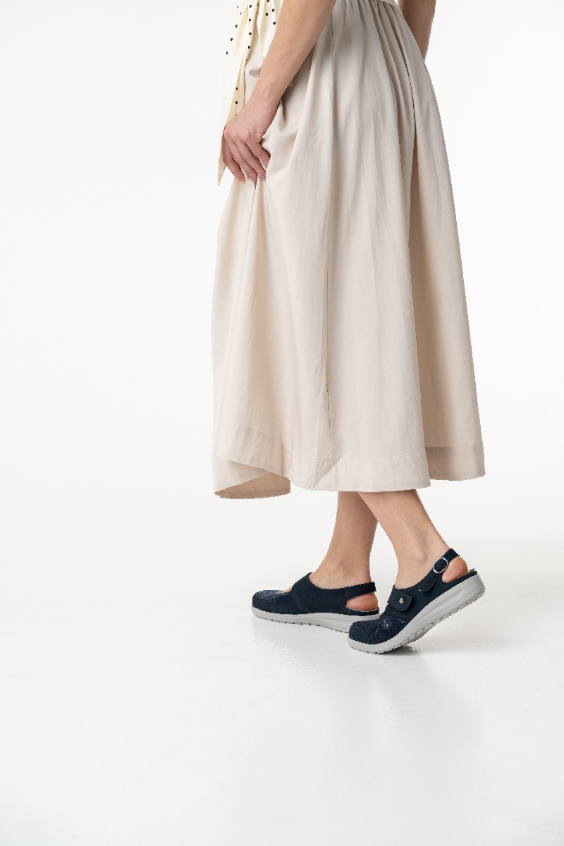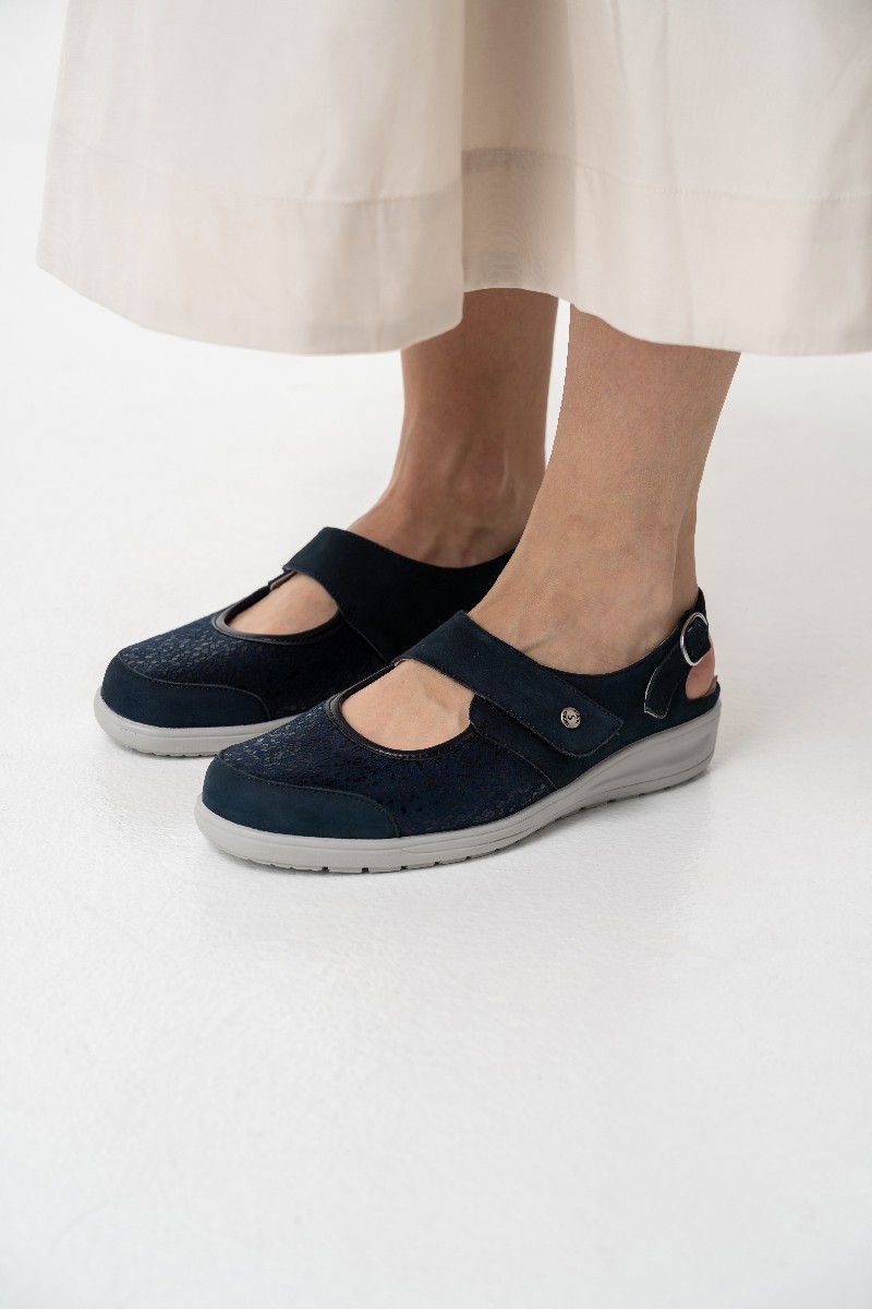 Летние туфли с открытой пяткой в синем цвете выполнены в увеличенной полноте и подходят для чувствительных стоп.