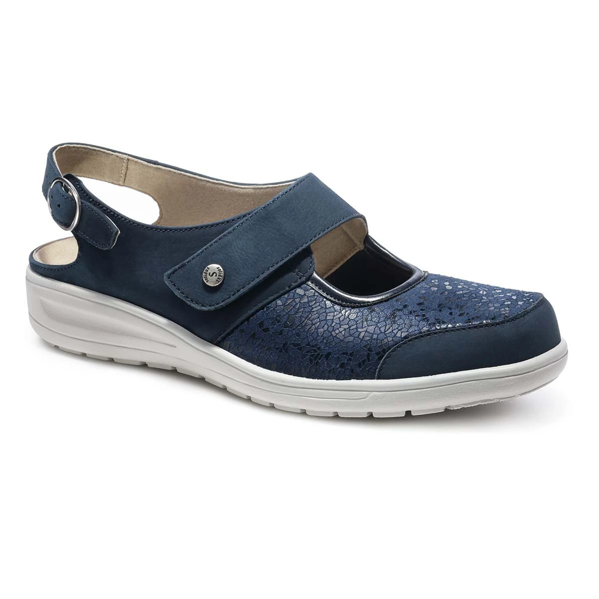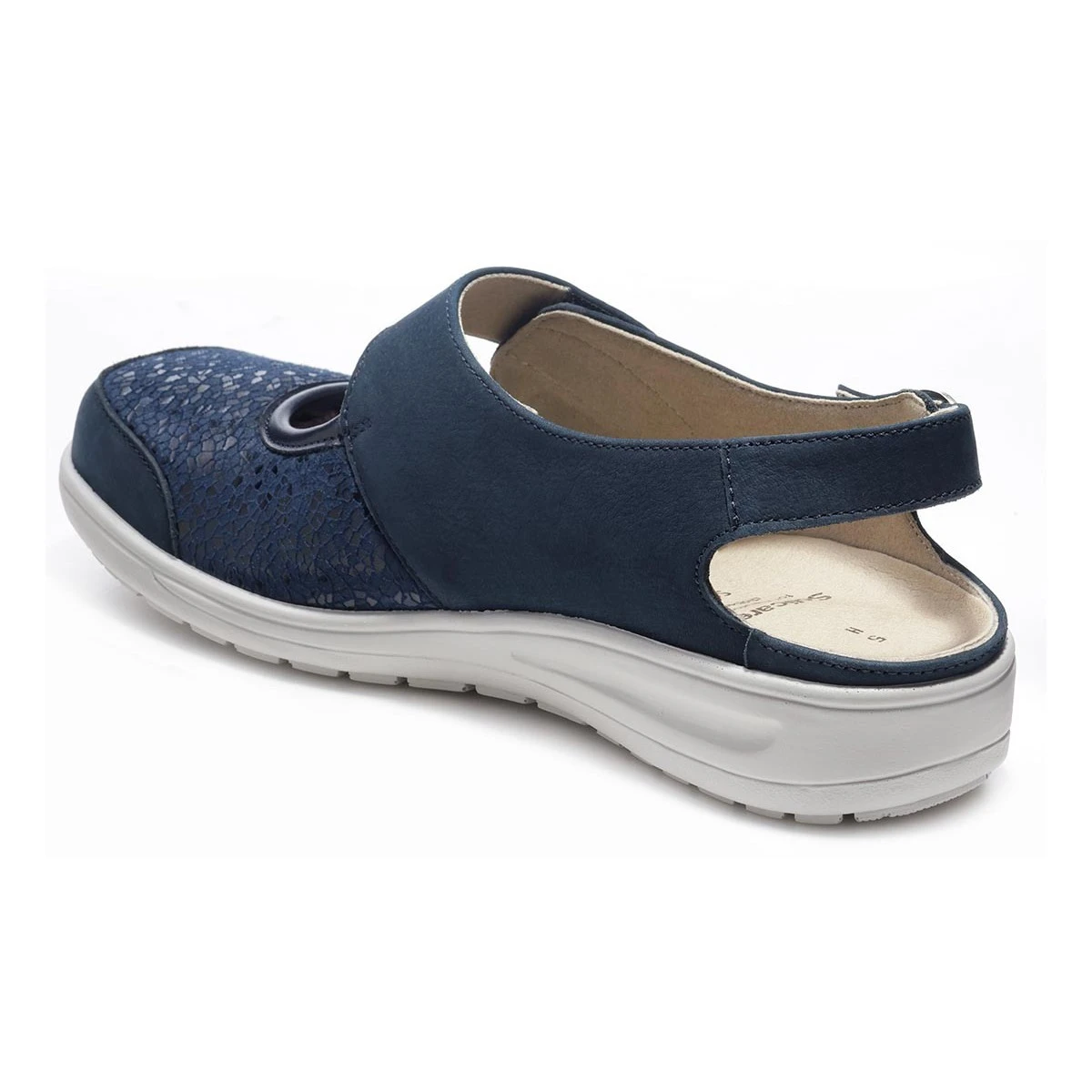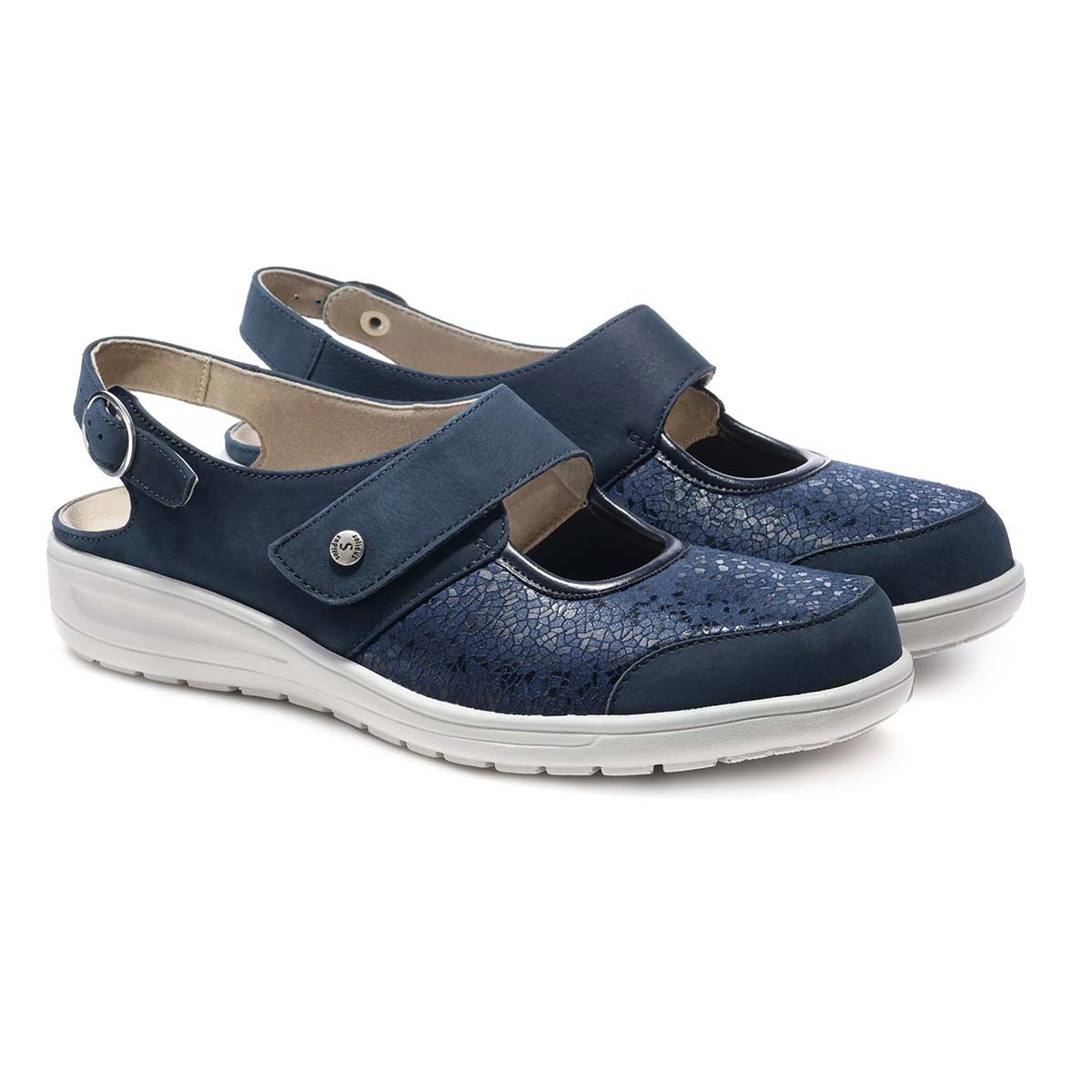 Летние туфли с открытой пяткой в синем цвете выполнены в увеличенной полноте и подходят для чувствительных стоп.