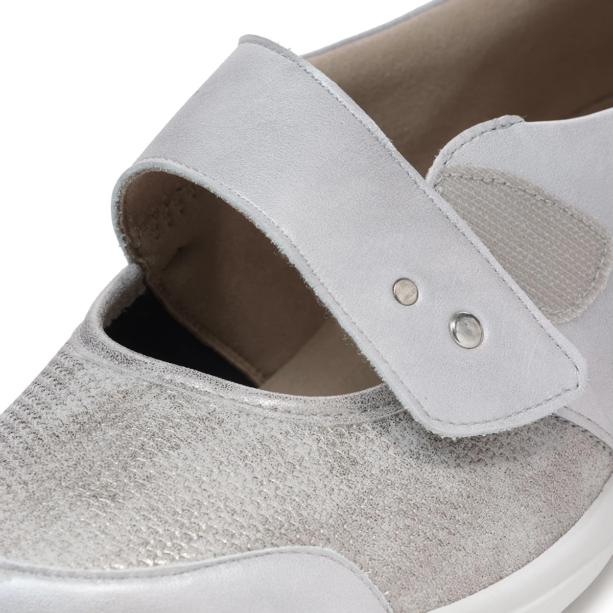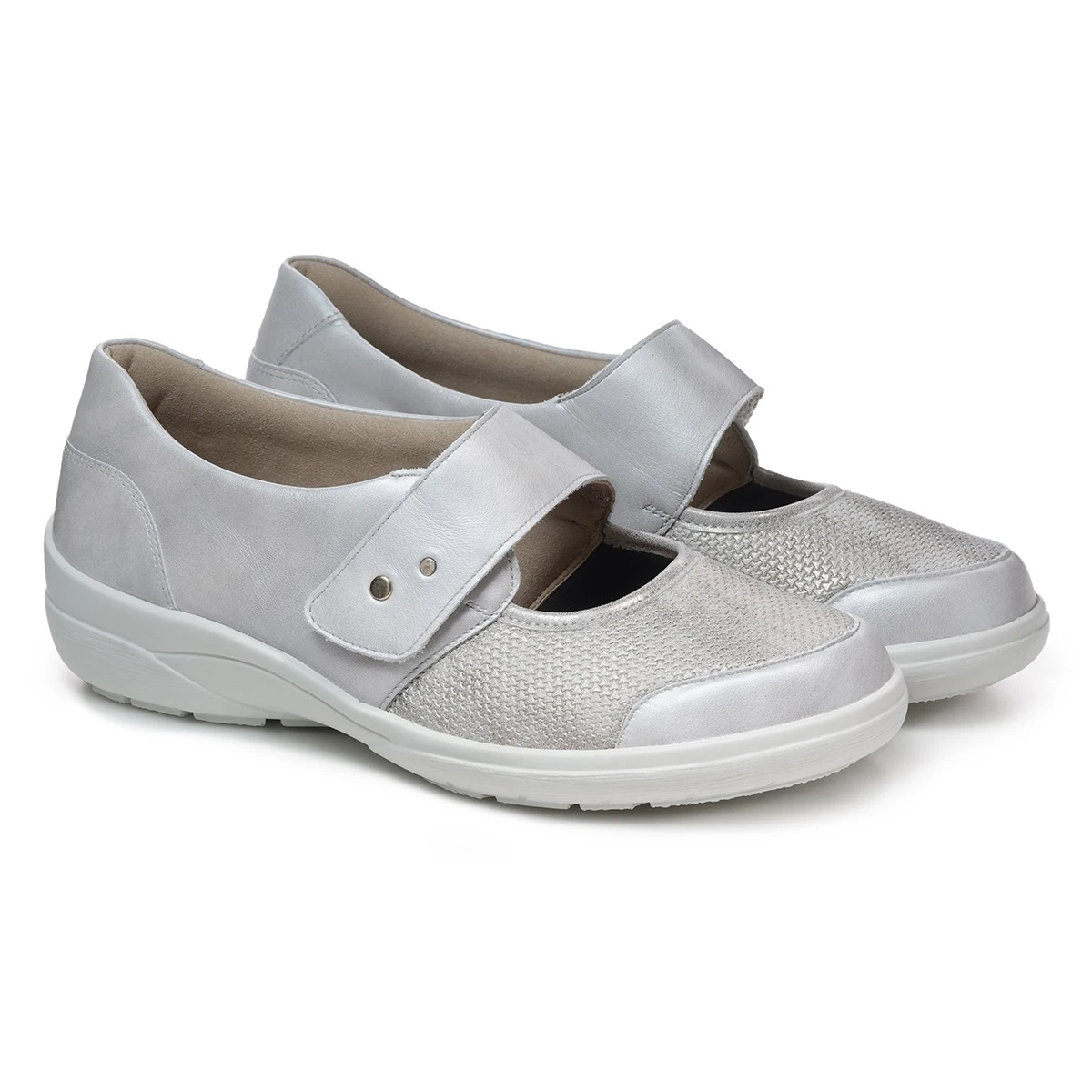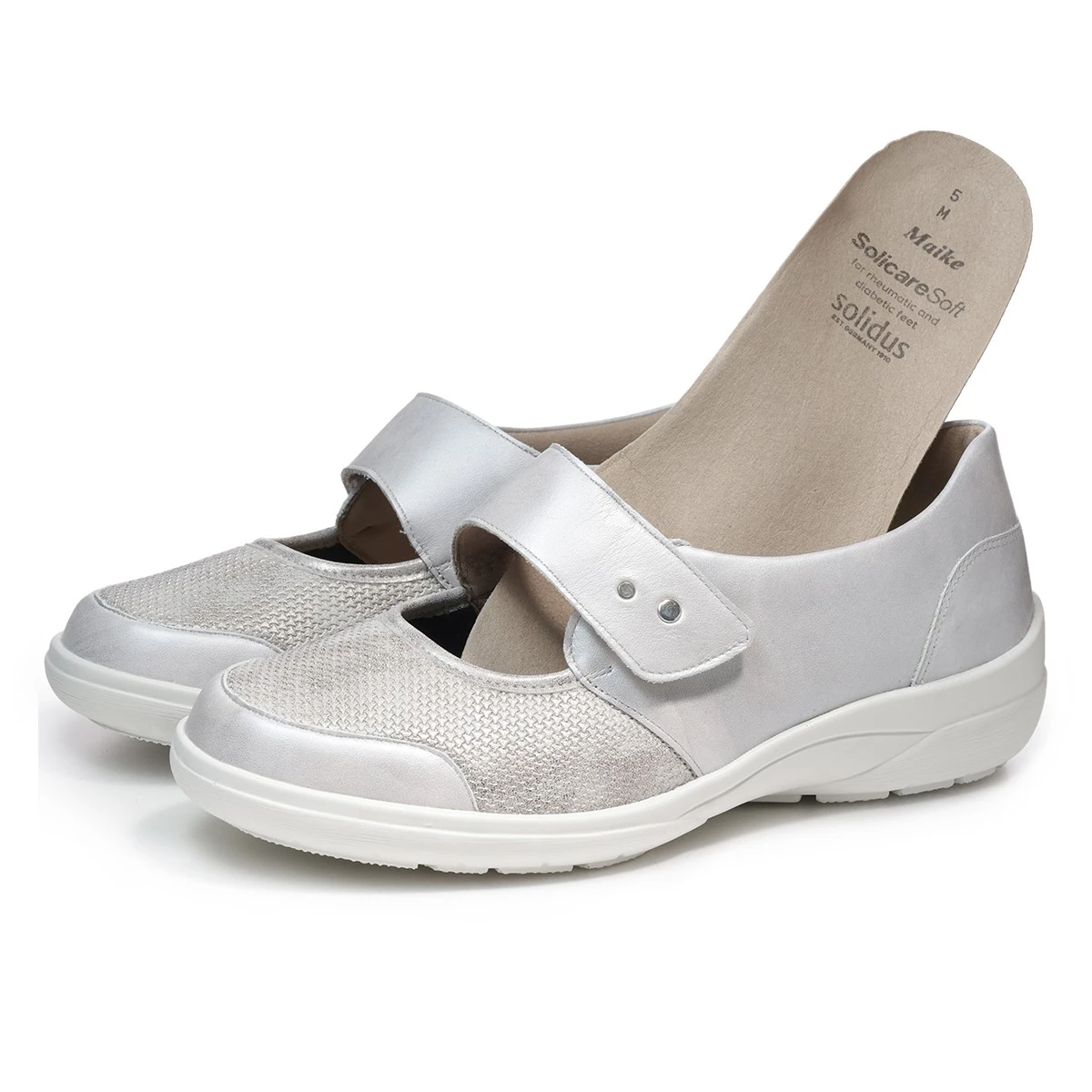 Практичные туфли Мэри Джейн от Solidus в элегантном серебристом оттенке с эластичными вставками на колодке Maike выполнены в очень широкой полноте.  Комфортные и мягкие туфли идеально сидят на ноге, скрывают деформации стопы и идеально подходят в качестве удобной повседневной обуви.