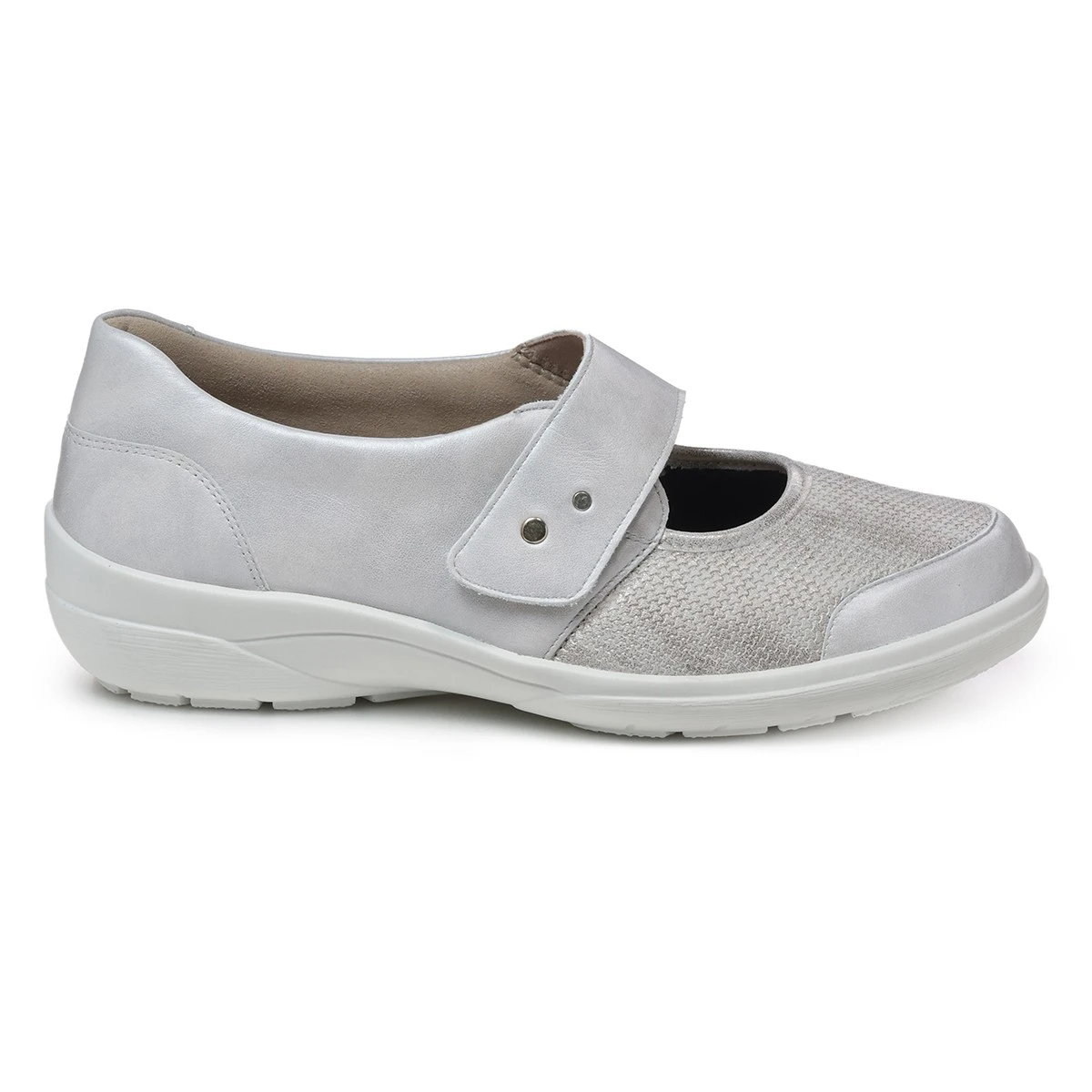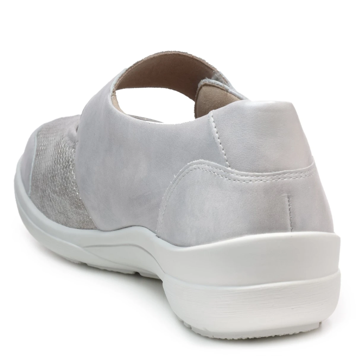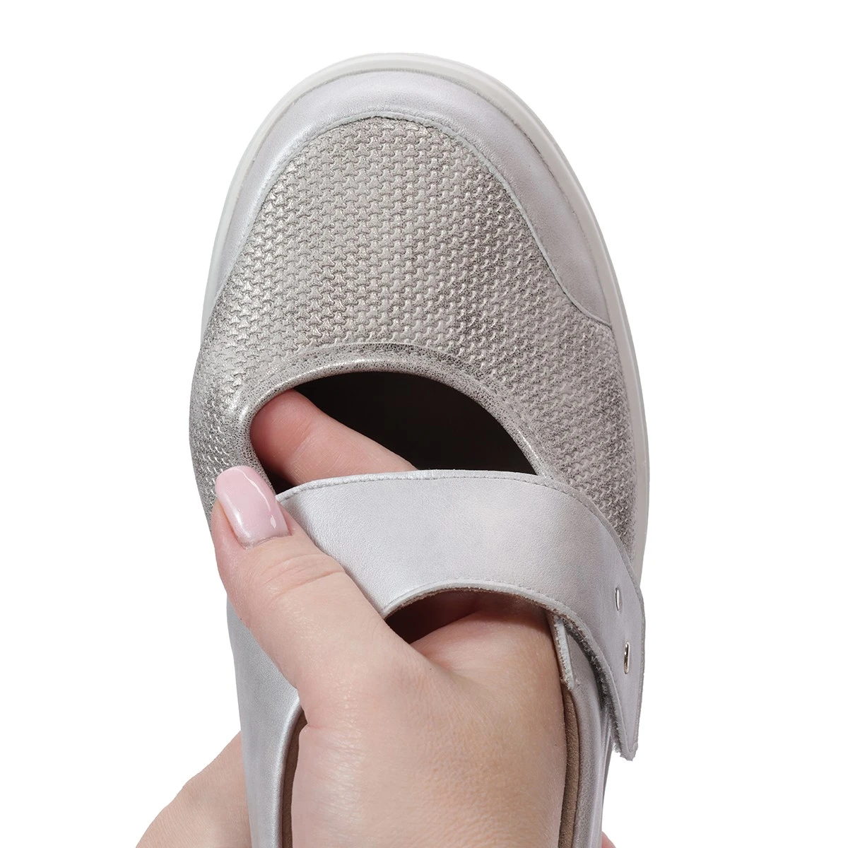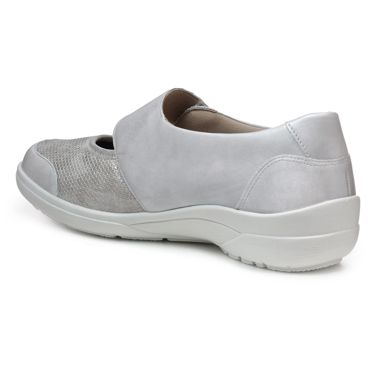 Практичные туфли Мэри Джейн от Solidus в элегантном серебристом оттенке с эластичными вставками на колодке Maike выполнены в очень широкой полноте.  Комфортные и мягкие туфли идеально сидят на ноге, скрывают деформации стопы и идеально подходят в качестве удобной повседневной обуви.