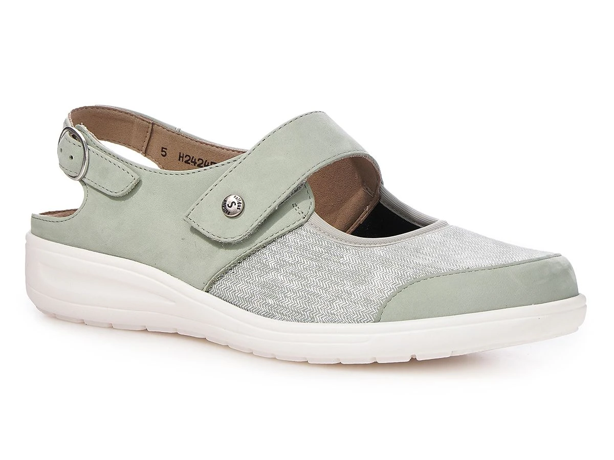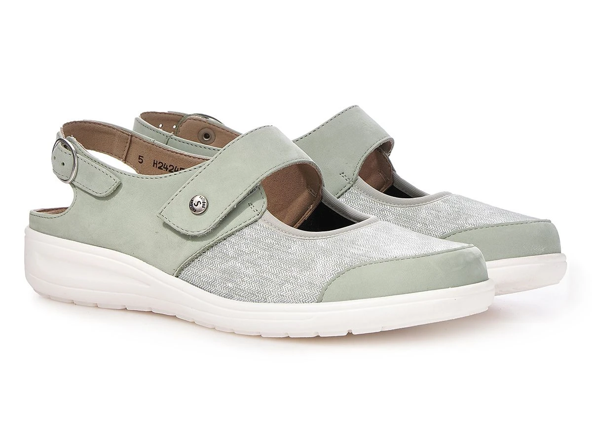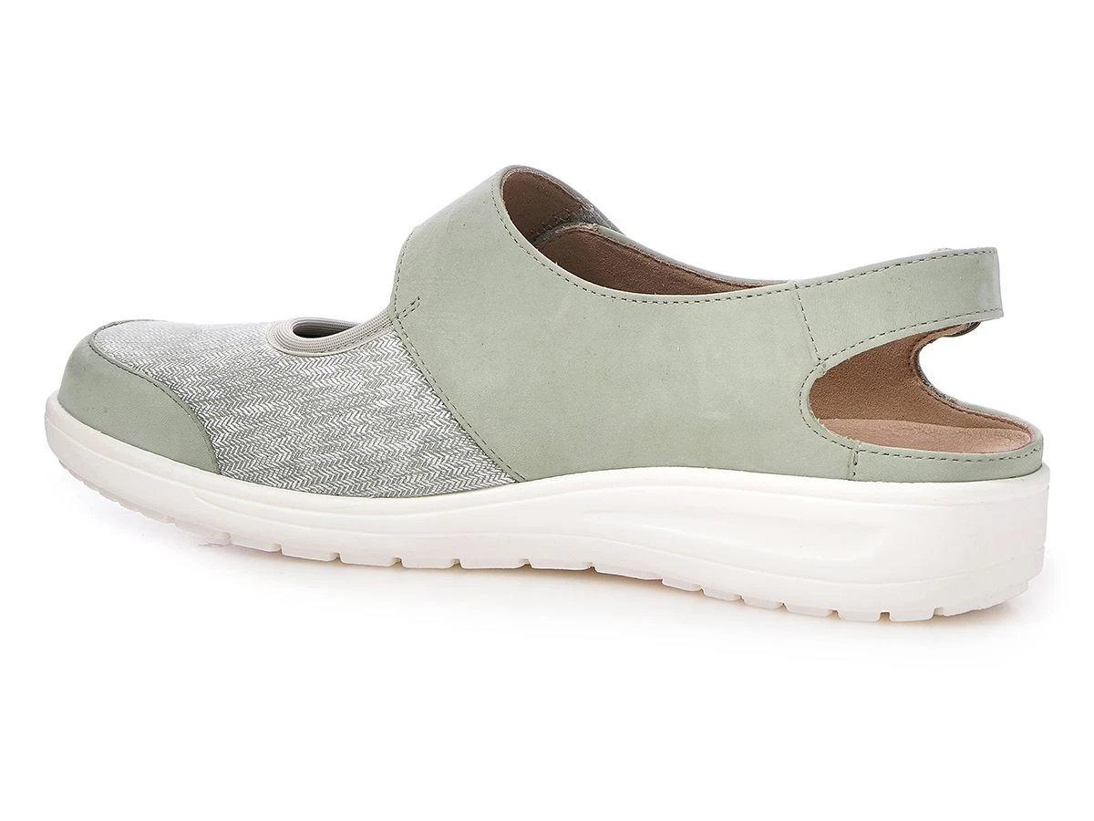 Летние туфли в красивом мятном оттенке с открытой пяткой полностью раскрываются благодаря широкой застежке велкро и пяточному ремешку на кнопке. Модель в увеличенной полноте подходит на широкую стопу.