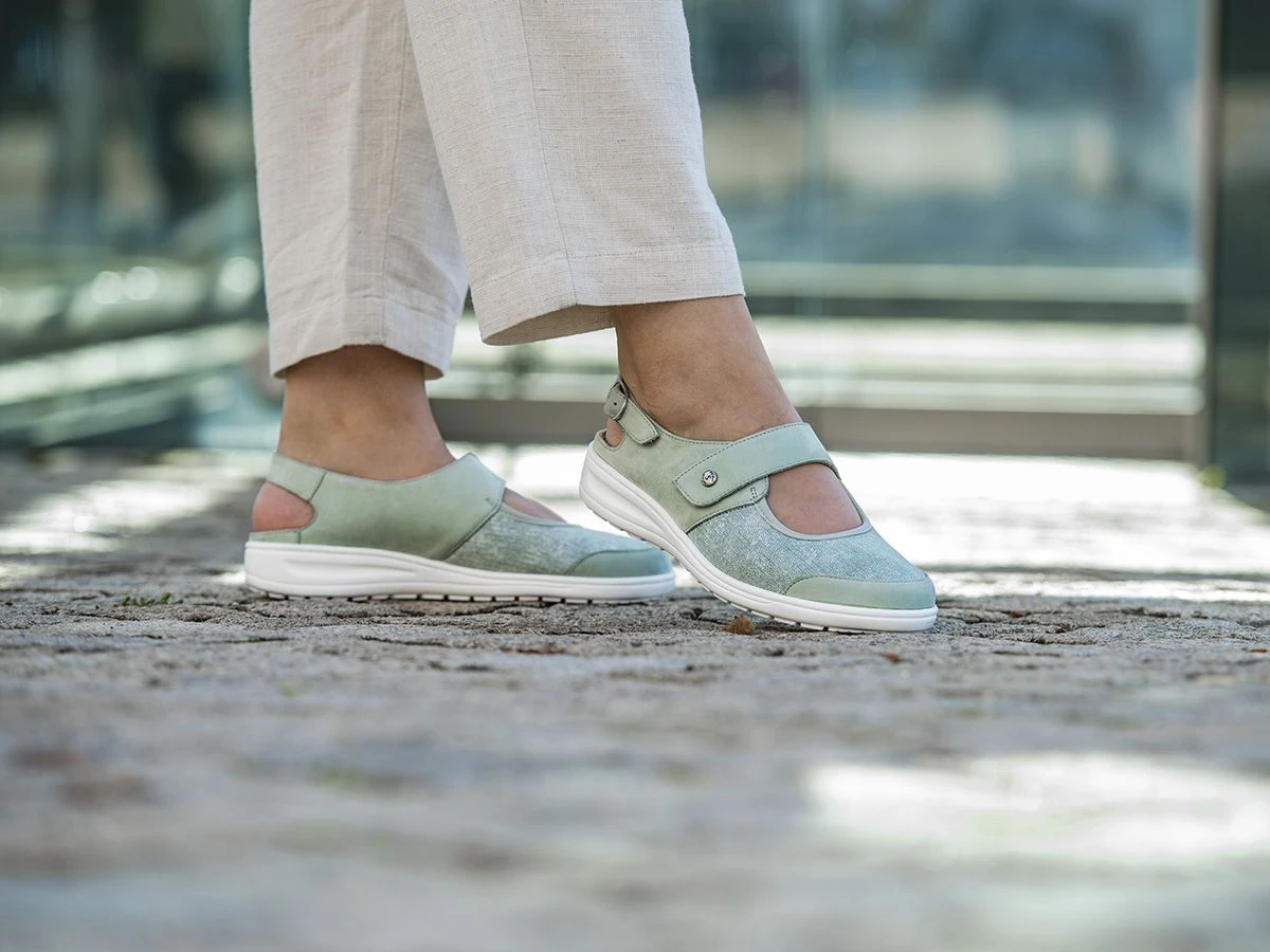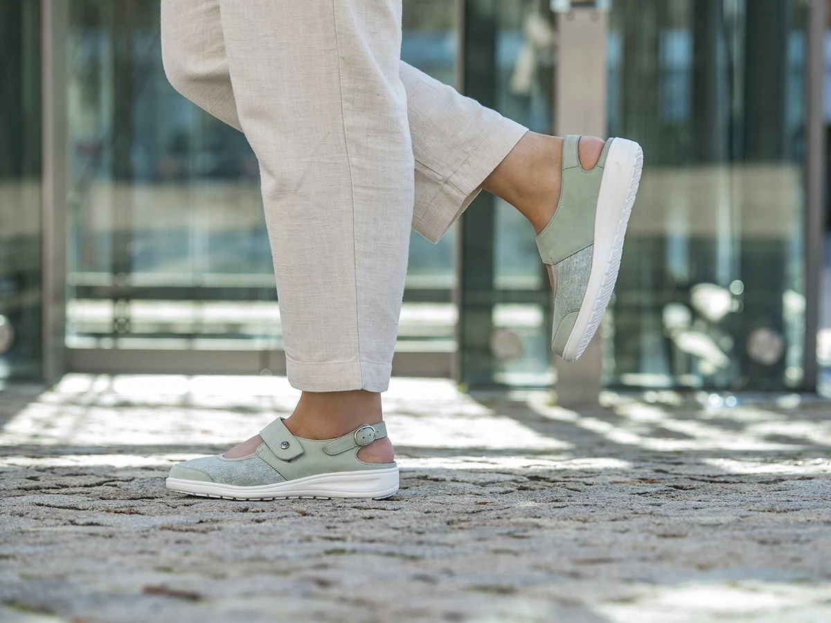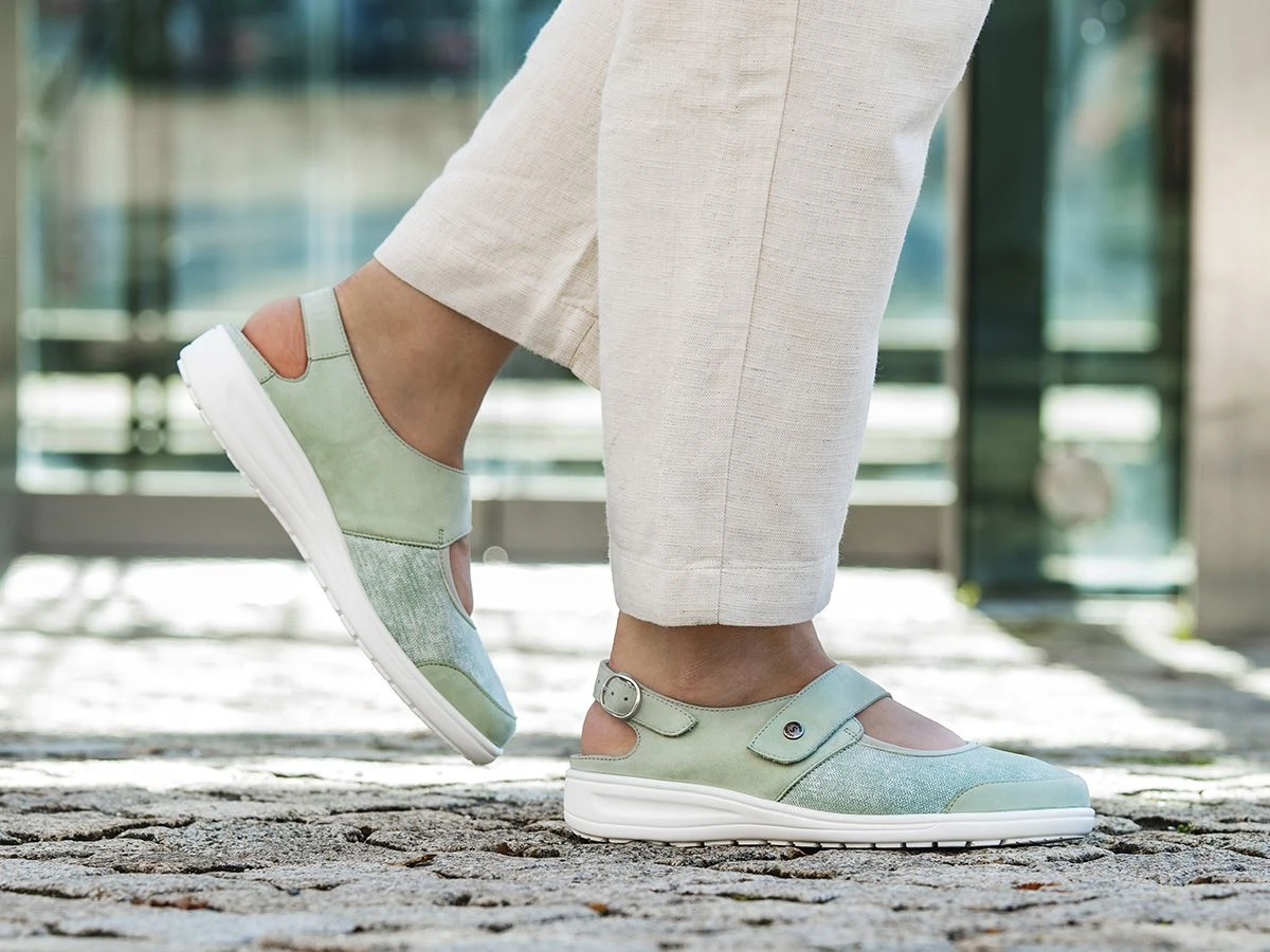 Летние туфли в красивом мятном оттенке с открытой пяткой полностью раскрываются благодаря широкой застежке велкро и пяточному ремешку на кнопке. Модель в увеличенной полноте подходит на широкую стопу.
