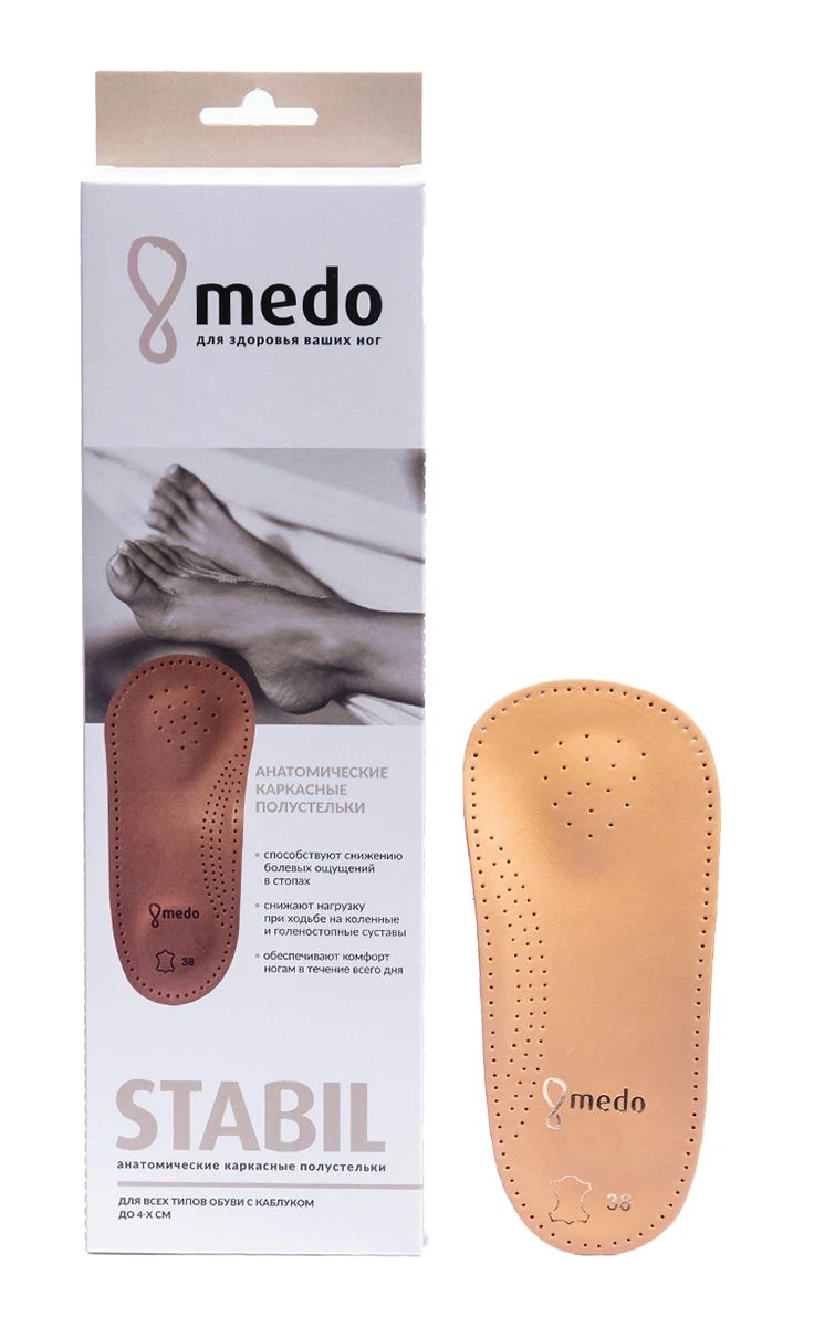 medo Stabil - анатомические полустельки с эргономическим каркасом и функцией Relaxflex (мягкость и расслабление), выполнены из натуральной овечьей кожи. Тонкая стелька отличается особым комфортом и гибкостью при ношении. Эргономический каркас обеспечивает амортизацию ударной нагрузки, метатарзальный пелот способствует правильной установке стопы и препятствует скольжению ноги в обуви, пяточный амортизатор уменьшает болевые ощущения в пяточной области. Имеется клеевой аппликатор для фиксации в обуви.