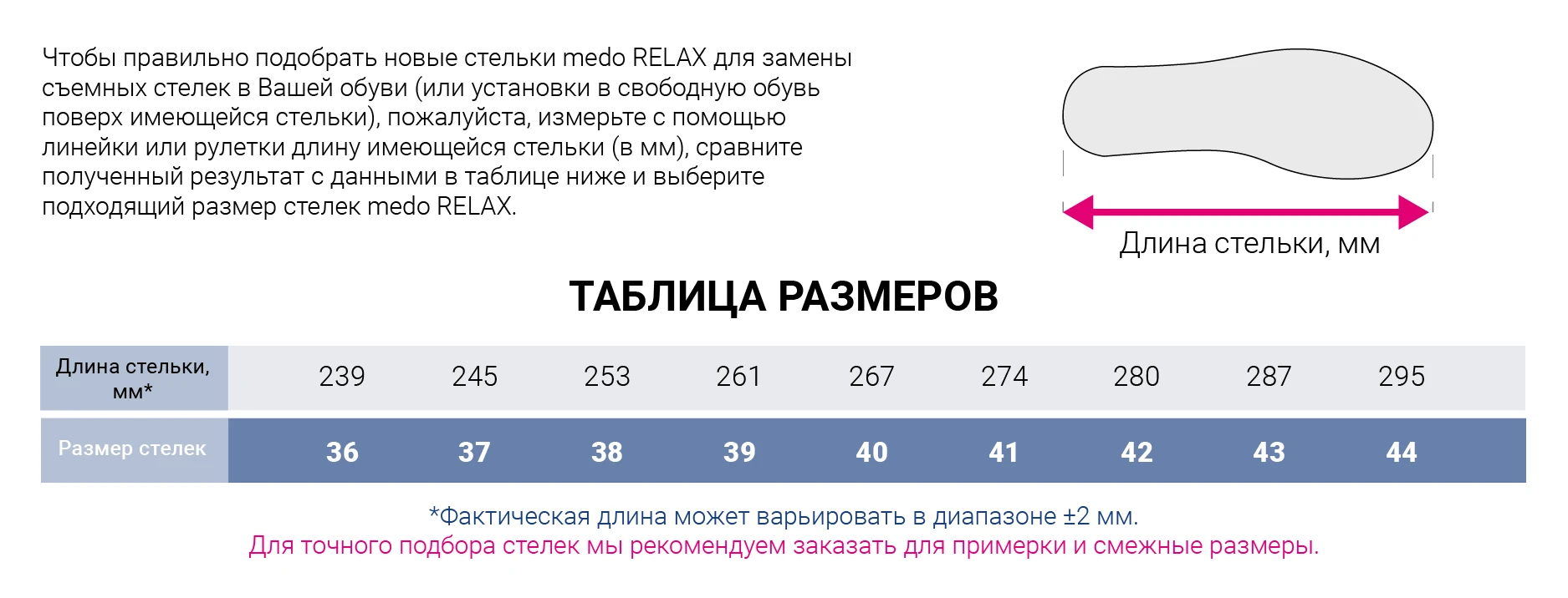 Анатомические бескаркасные стельки medo Relax рекомендованы для использования в случаях, когда использование каркасных стелек доставляет дискомфорт. Мягкая вставка из вспененного латекса обеспечивает комфорт чувствительным стопам. Благодаря незначительной толщине стельки medo Relax подходят для регулярного использования в повседневной и модельной обуви, в том числе обуви на высоком каблуке.