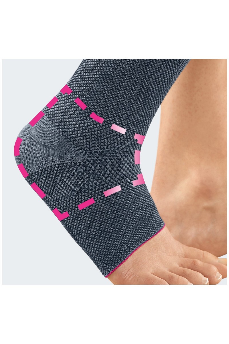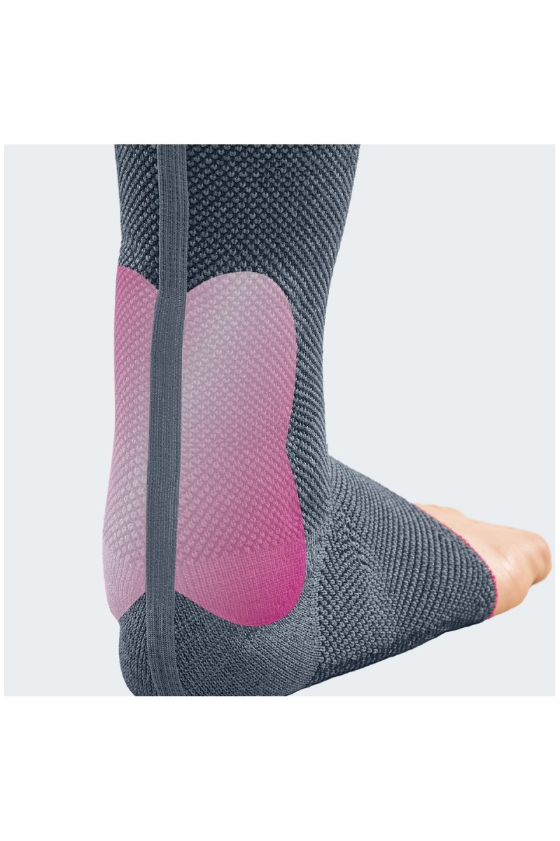 Компрессионная ткань улучшает кровообращение и питание тканей, ускоряя восстановление. За счет этого быстрее рассасываются гематомы и отеки, снижается интенсивность болевого синдрома. В комплекте находятся специальные подпяточники, которые уменьшают натяжение и болезненность ахиллова сухожилия во время ходьбы, а также специальный носок для облегчения надевания бандажа.