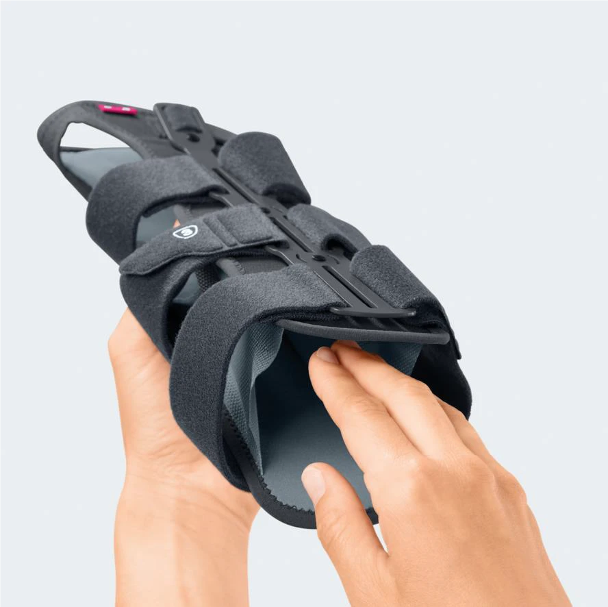 Широкое отверстие обеспечивает простое надевание даже с повязкой. По мере уменьшения отека или снятия повязки, ортез можно отрегулировать локально благодаря ремням на липучке.