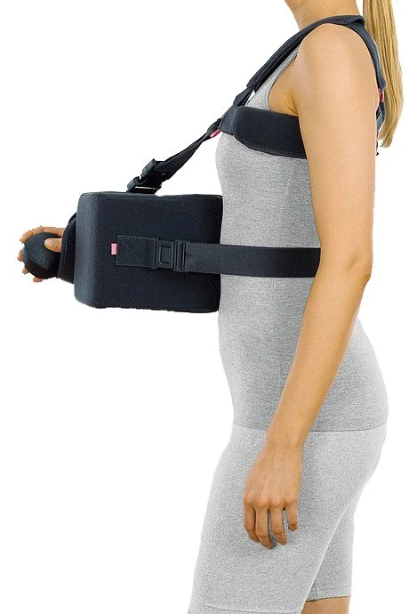 Изделие состоит из подушки анатомической формы и системы фиксирующих ремней, с помощью которых можно надежно зафиксировать руку в нужном положении относительно туловища. В положении отведения 5° и одновременной наружной ротации 90° плеча задние отделы капсулы находятся в расслабленном состоянии, что обеспечивает быстрое и безболезненное заживление.