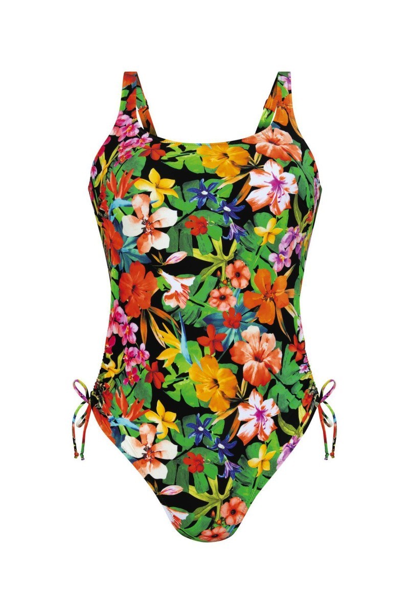 Молодежный купальник с уплотненными чашками-лепестками и легкой драпировкой в области груди имеет по бокам вырезы на завязках, чтобы визуально удлинить ножки.