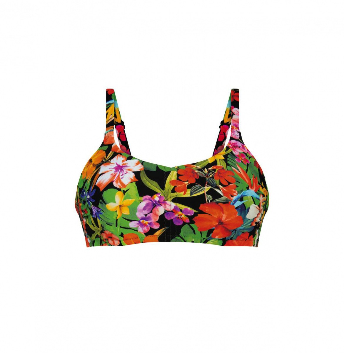 Tоп бикини с изящными сборками на груди и регулируемой высотой декольте при помощи узких завязок обязательно оценят любительницы пляжной моды.