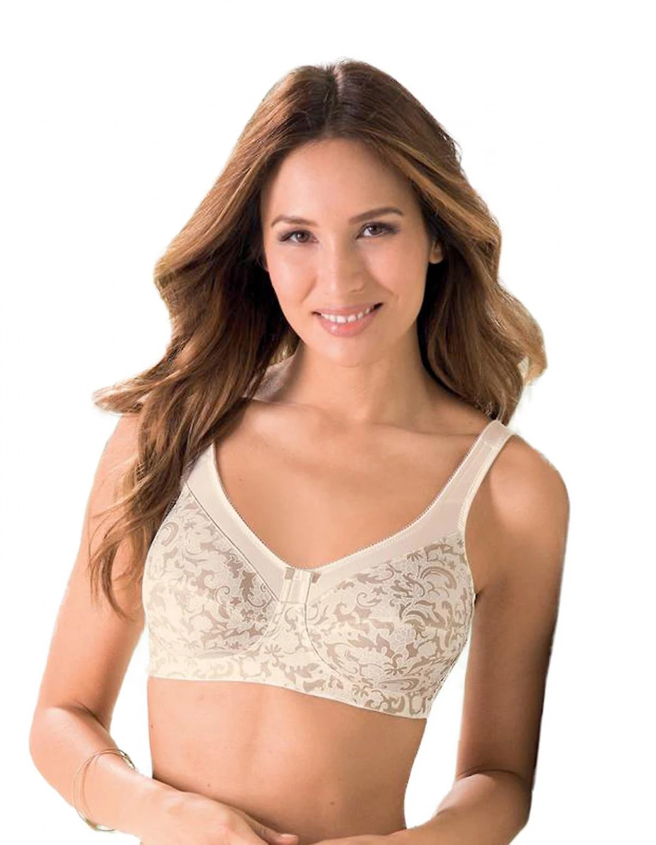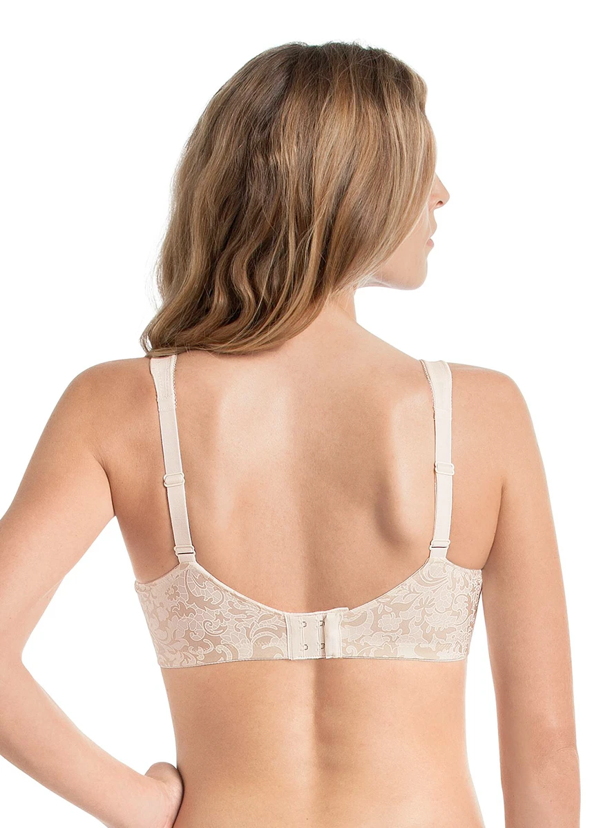 Бюстгальтер из гладкой ткани с принтом, имитирующим кружево. Чашки на неэластичной подкладке придают бюсту привлекательную форму. Однотонные вставки по вырезу облегчают зону декольте.